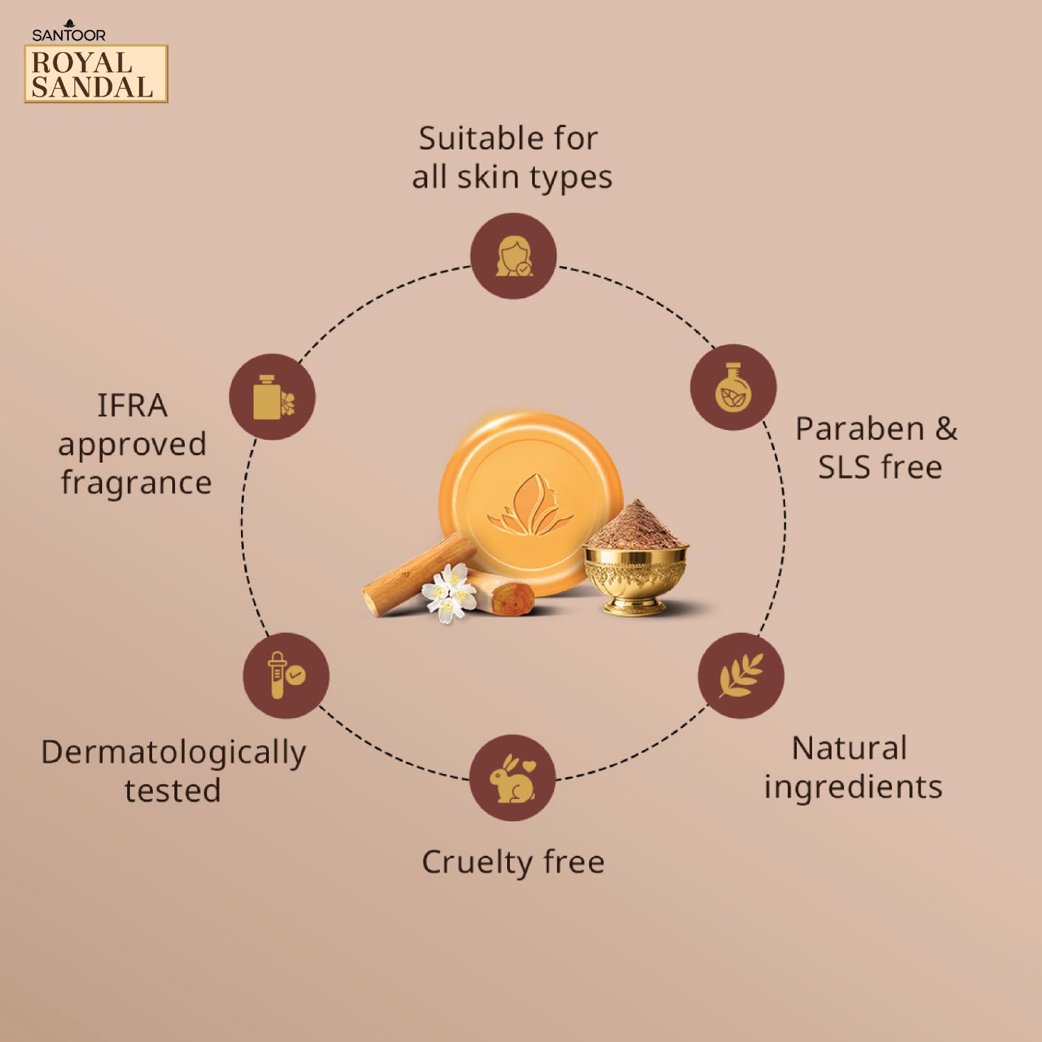 3X Sandalwood Action – Deep Cleanse, Brighten & Even Skin Tone: Santoor Royal Sandal Soap: Deeply cleanses and removes tan Santoor Royal Sandal Face Serum: Absorbs quickly to enhance glow and even skin tone Santoor Royal Sandal Face Pack: Provides deep exfoliation and clarity for a naturally bright, blemish-free look