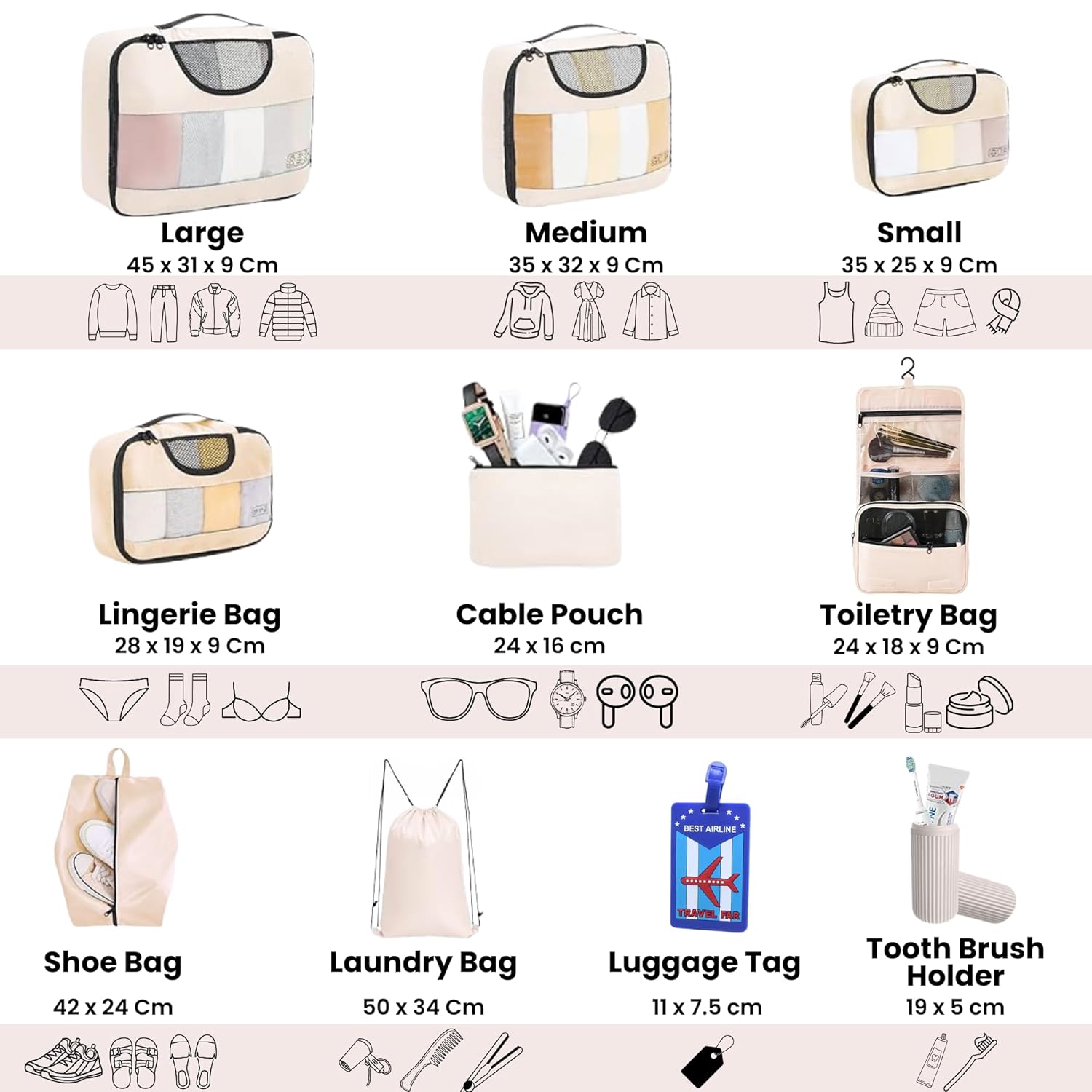 Be the first to review “Set of 10 Packing Cubes with Luggage Tag and Toothbrush Holder, Travel Organizer Bags for Luggage, Suitcase Organizer for Clothes, Shoes, and Lingerie | Model 2.0 – Beige”