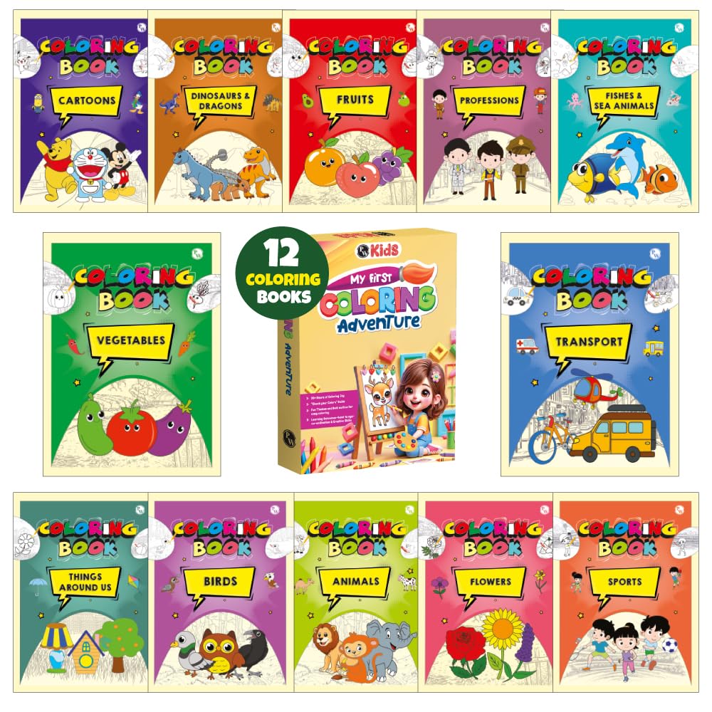 What’s Inside: 12 Engaging & Fun-Filled Books, each on an attractive topic that ignites curiosity and enhances vocabulary: AnimalsBirdsCartoonsDinosaurs & DragonsFishes & Sea AnimalsFlowersFruitsProfessionsSportsThings Around UsTransportVegetables