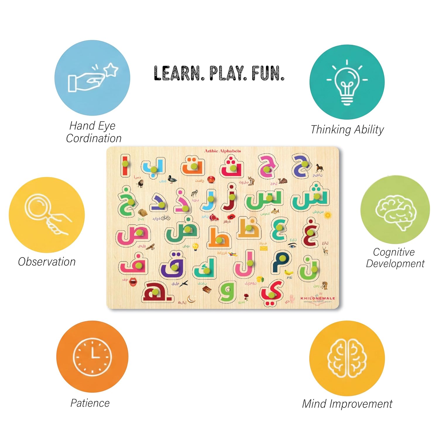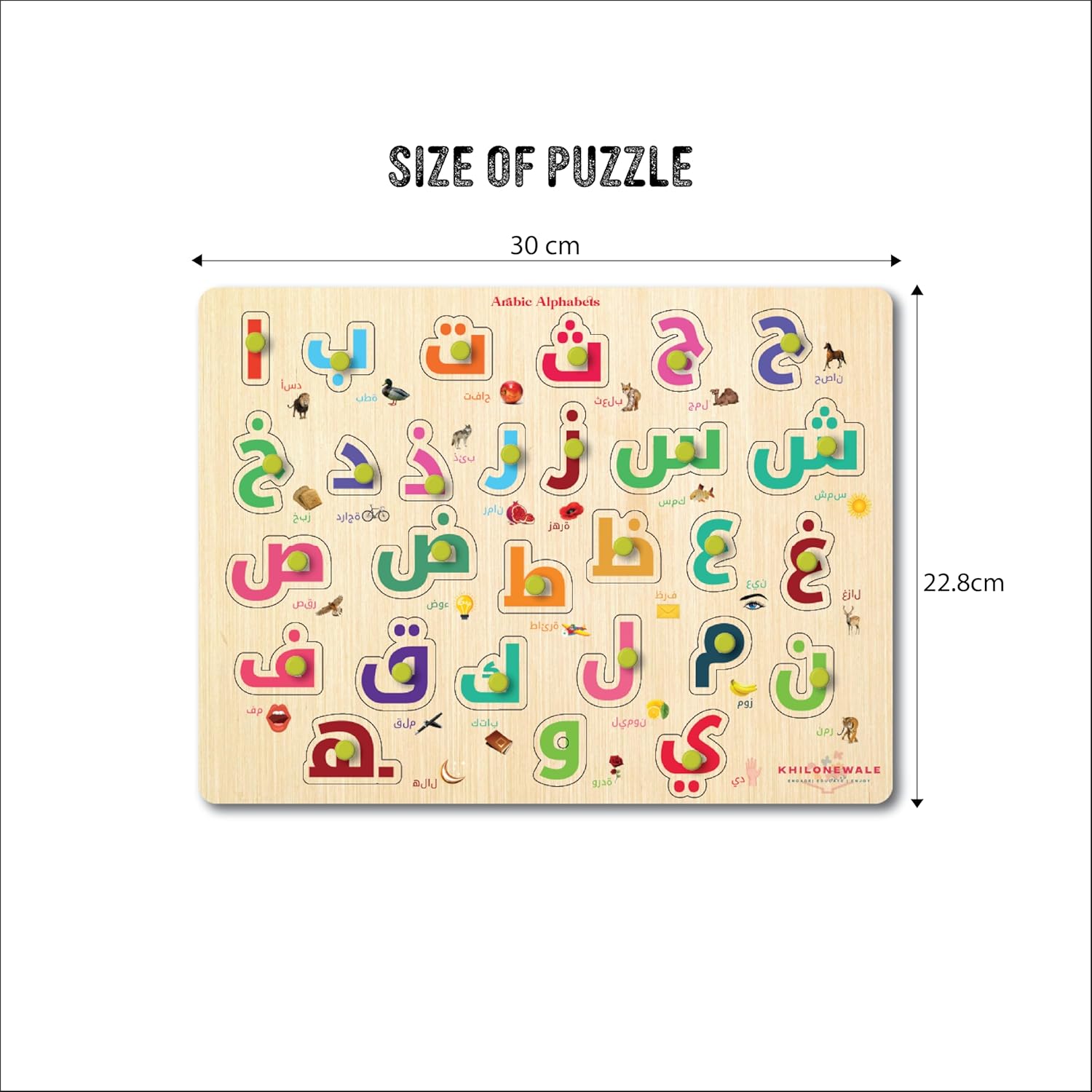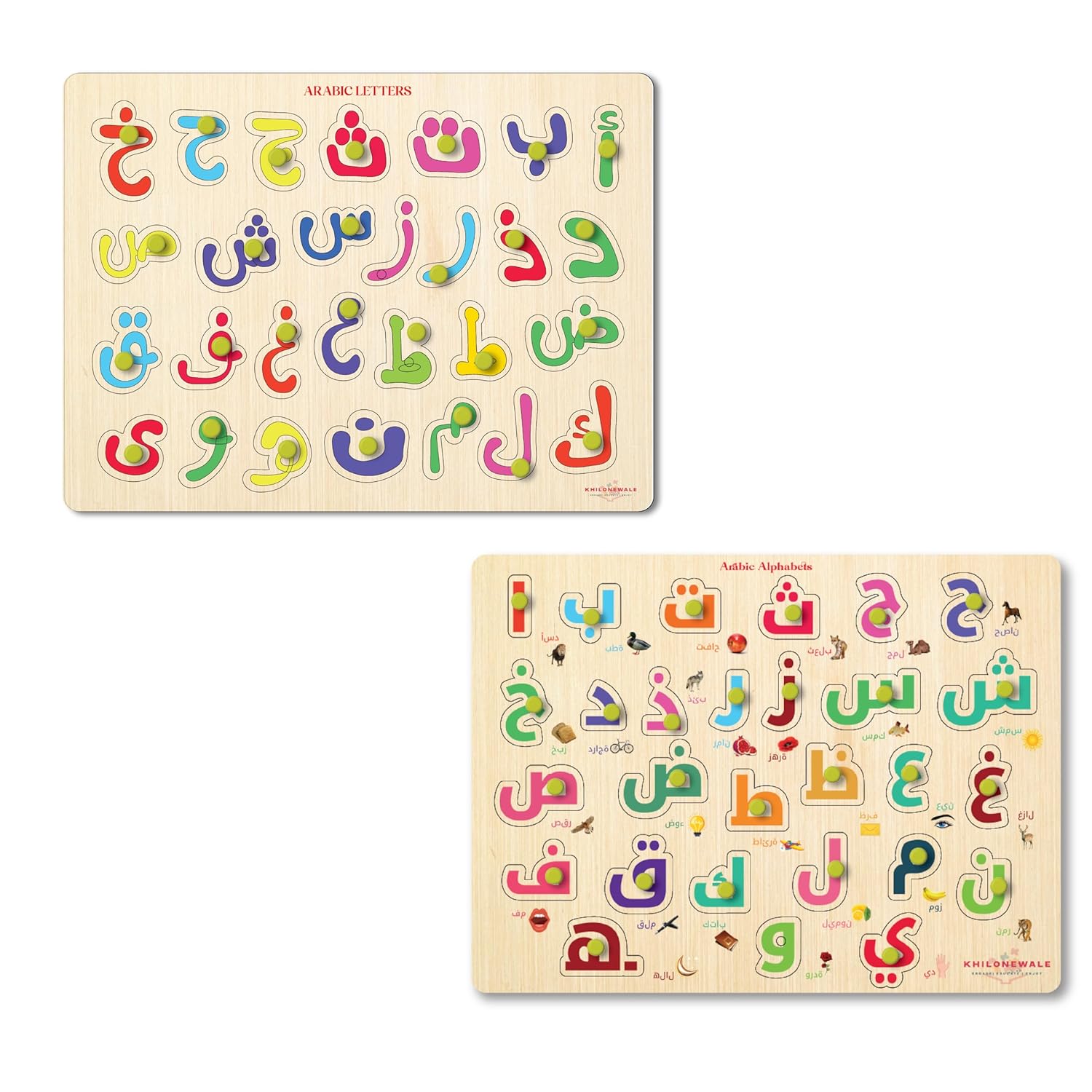 Early Arabic Learning Tool: Set of 2 wooden knob puzzles designed to introduce kids to Arabic letters and basic word recognition in a fun, interactive way.
