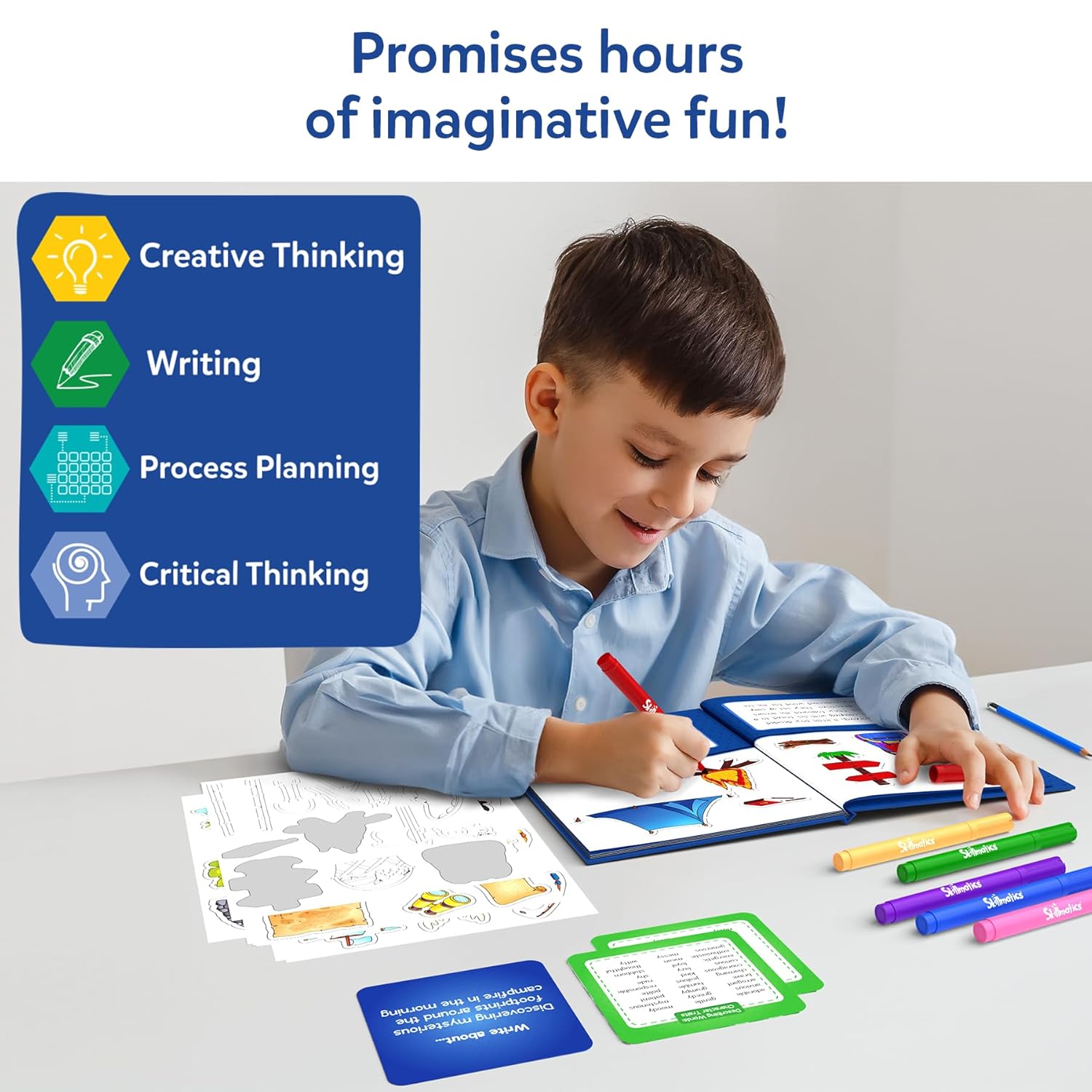CREATE YOUR OWN STORYBOOKS: Step into the thrilling world of adventure with Skillmatics’ Storybook Art Kit! Our kit includes everything your child needs to become an author – writing prompts, vocabulary lists, colourful stickers, markers, and hardbound books for their stories!
