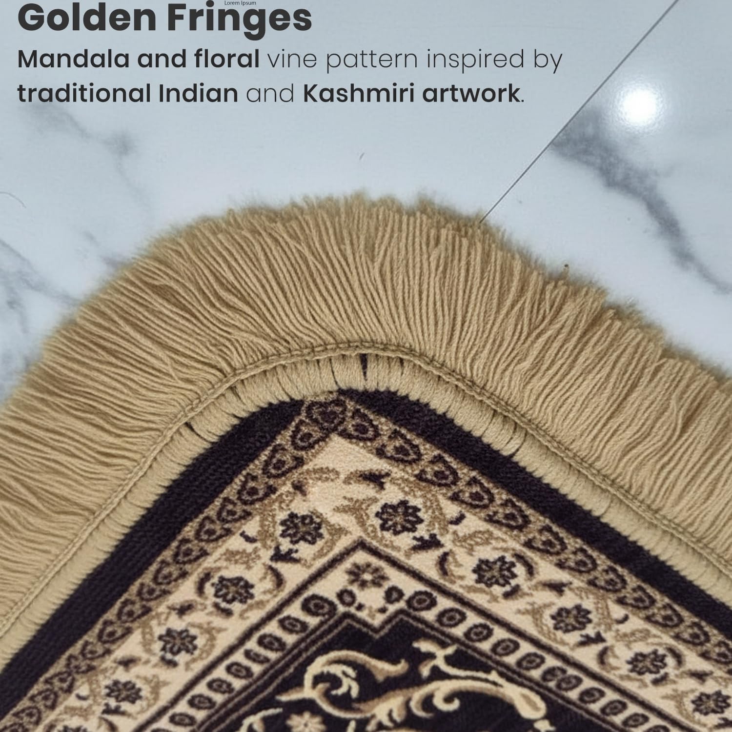 Bring comfort, tradition, and elegance to your spiritual setting with the Moin Carpets Soft Chenille Prayer Mat. Crafted from good-quality Chenille, this pooja aasan provides a plush and supportive sitting surface ideal for daily pooja, meditation, or yoga practices. Its soft texture ensures long-lasting comfort, while the durable weave maintains its shape and beauty even after extended use. Designed with a stunning floral mandala centerpiece, the mat features intricate vine work and leafy scroll patterns inspired by Indian and Kashmiri embroidery art. The ornate geometric borders and luxurious golden fringes create a visually rich and culturally rooted look that enhances any mandir or spiritual corner. Whether placed in your pooja room, living area, garden, or meditation space, it adds warmth and aesthetic charm to your surroundings. The thick cushioned surface supports your posture during extended rituals, ensuring focus and relaxation during meditation or breathing exercises. Its non-slippery base adds stability, making it suitable for a variety of activities such as yoga, chanting, or simply sitting on the floor comfortably. This versatile mat is perfect for festive rituals, temple ceremonies, spiritual gatherings, or everyday devotional use. Lightweight and easy to fold, it is also ideal for travel, office puja, or outdoor prayer sessions. Maintenance is simple, making it a practical yet elegant accessory for your home. Experience comfort, tradition, and artistry together with this beautifully crafted mandala prayer mat—an essential addition to any spiritual home.