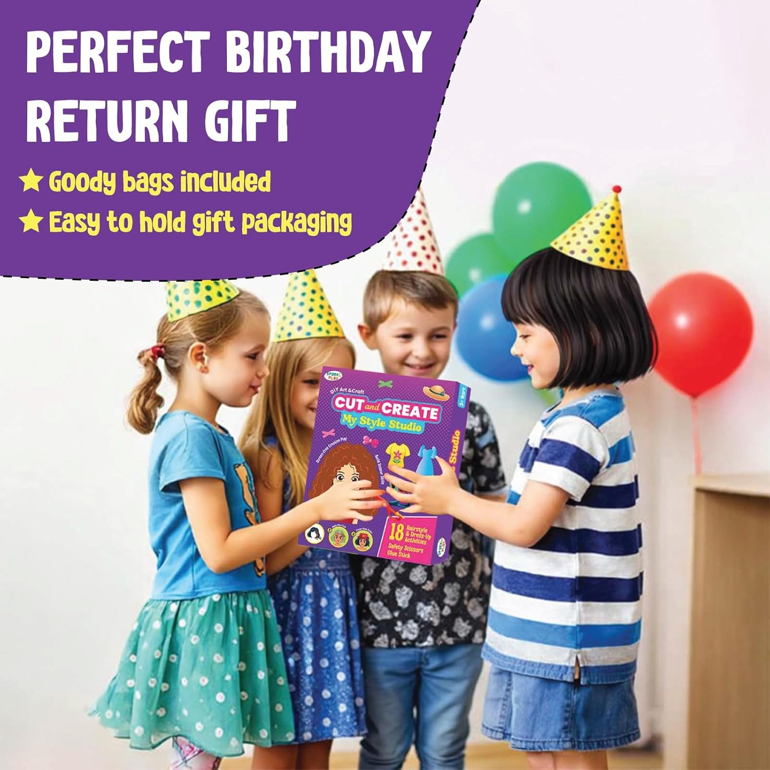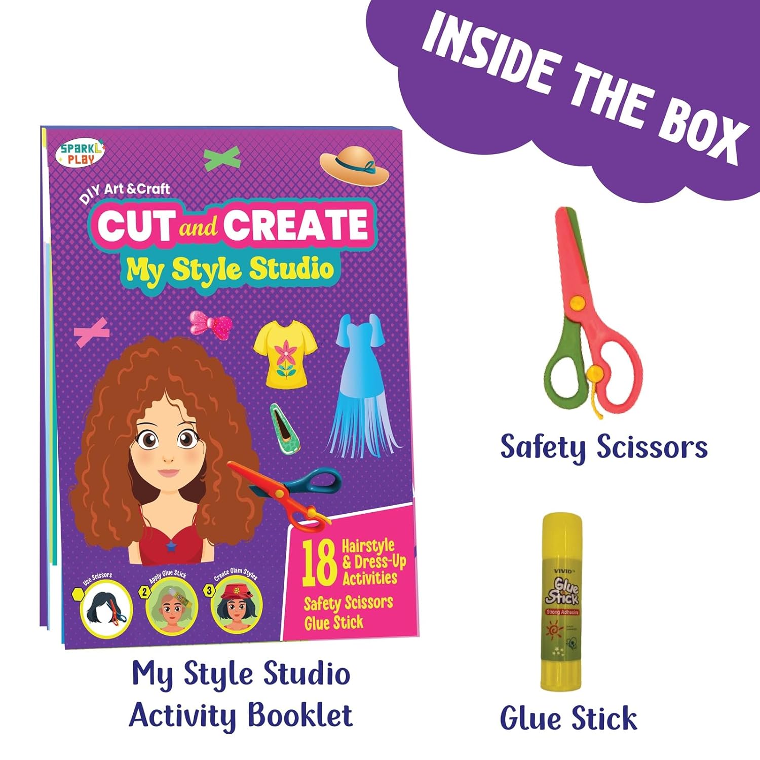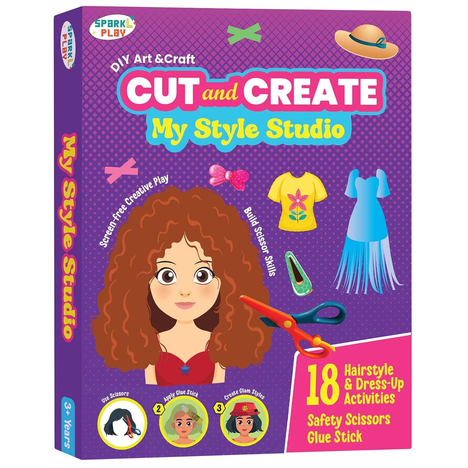 SparkLPlay My Style Studio is a fun scissor craft kit that lets kids cut, style, and create their own fashion looks. Designed for girls ages 3+, it turns scissor practice into exciting hairstyle and dress-up play. With 18 creative cutting activities, kids learn step by step from easy cuts to more detailed designs. The kit includes child-safe scissors and a glue stick, making it safe and ready to use. As kids cut and paste, they build fine motor skills, focus, and confidence. Encourages creativity, imagination, and screen-free playtime. Perfect for birthdays, return gifts, holidays, and craft time at home. Comes in a gift-ready box that kids love to open and parents trust to give.
