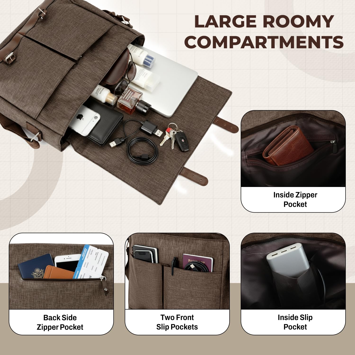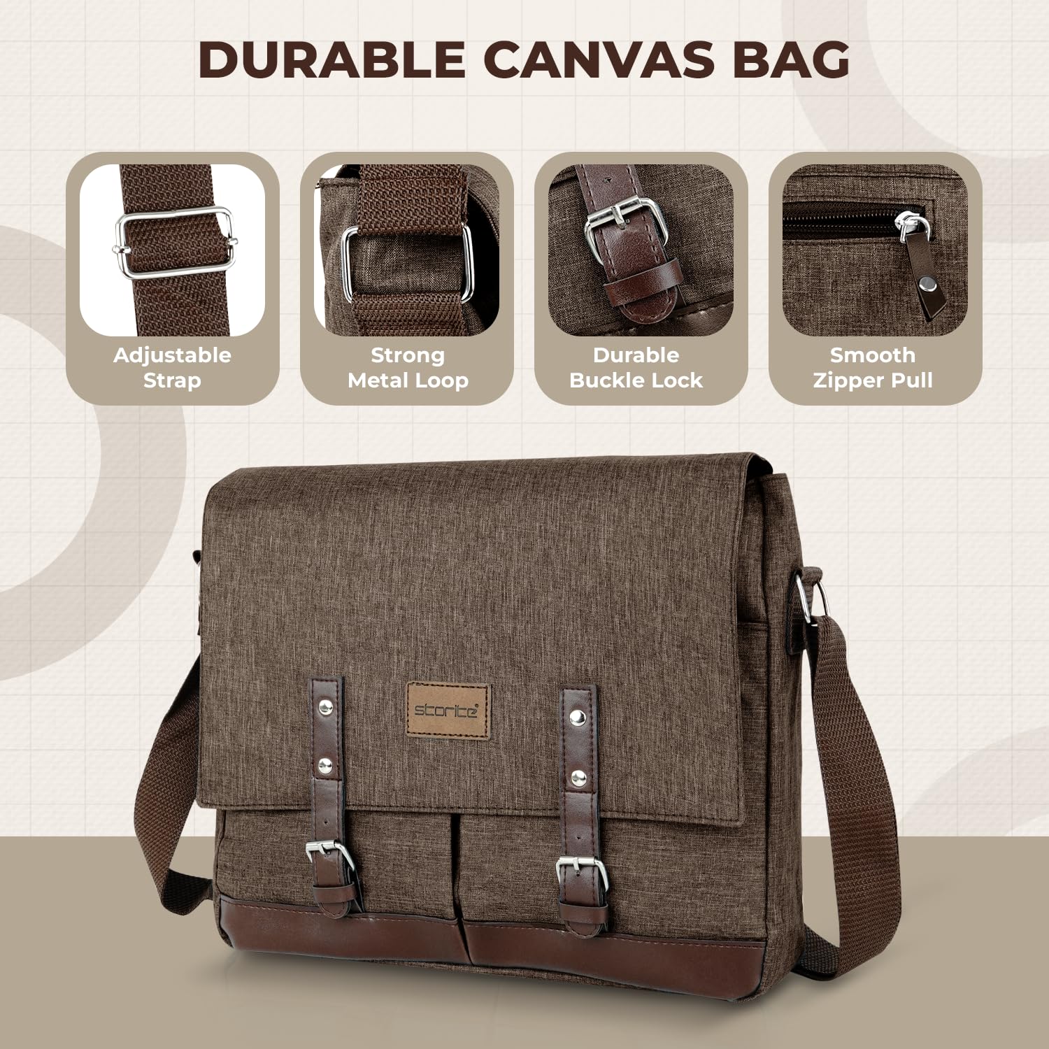 Carry your essentials in style with the Storite Laptop Messenger Bag, designed for maximum organization and everyday comfort. It features one large main compartment with a zipper for your laptop and documents, plus two front pockets for quick-access items. Inside, you’ll find a small pocket for accessories and a secure inner zipper pocket for valuables. A back zipper pocket adds extra convenience for phones or travel documents. Crafted from water-resistant polyester and accented with leatherette detailing, this lightweight yet durable bag combines utility with a premium professional look — perfect for work, college, or travel.