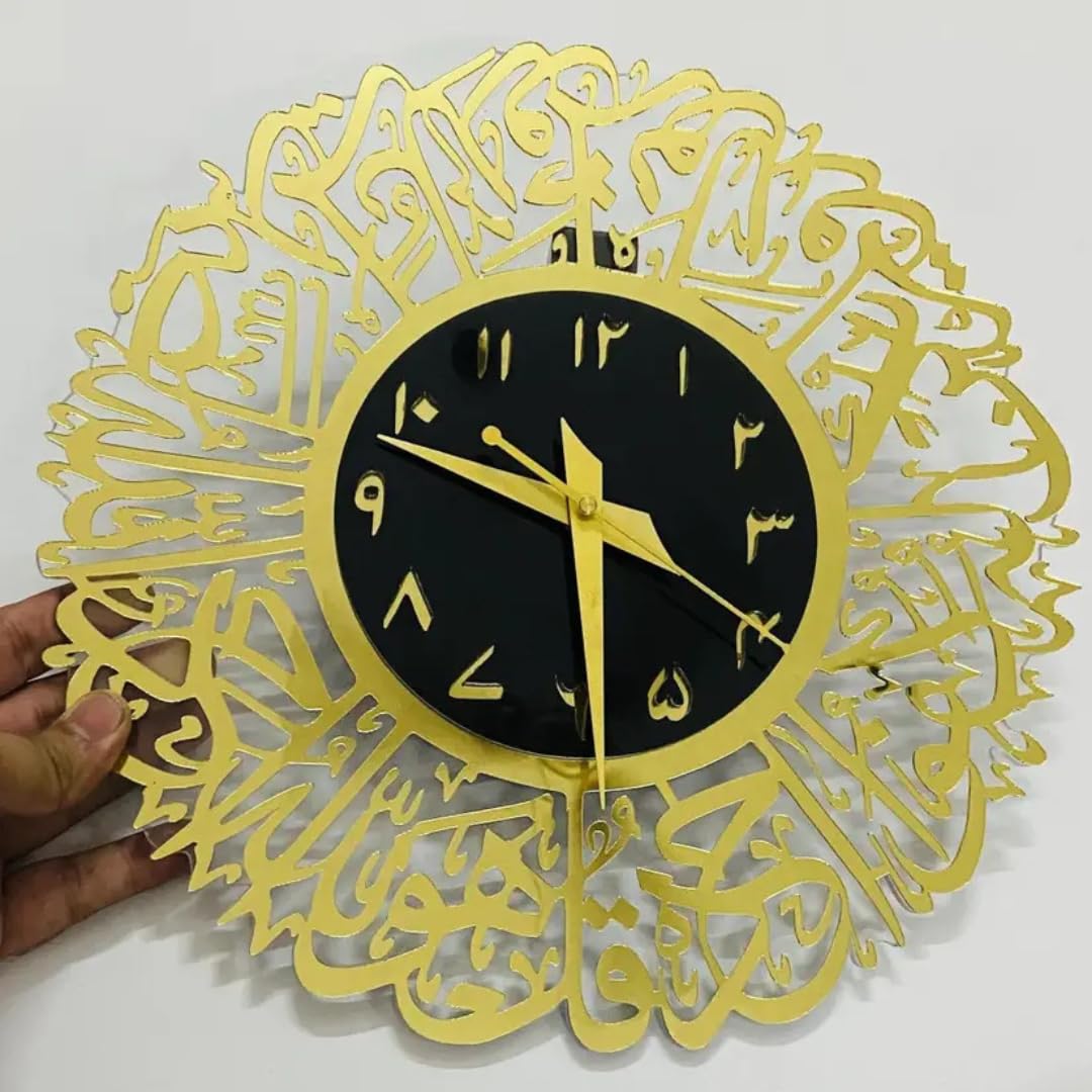 Surah Al-Ikhlas Islamic Wall Clock, Black and Gold Acrylic, Arabic Calligraphy Design, Round Shape, 30cm, Battery Powered