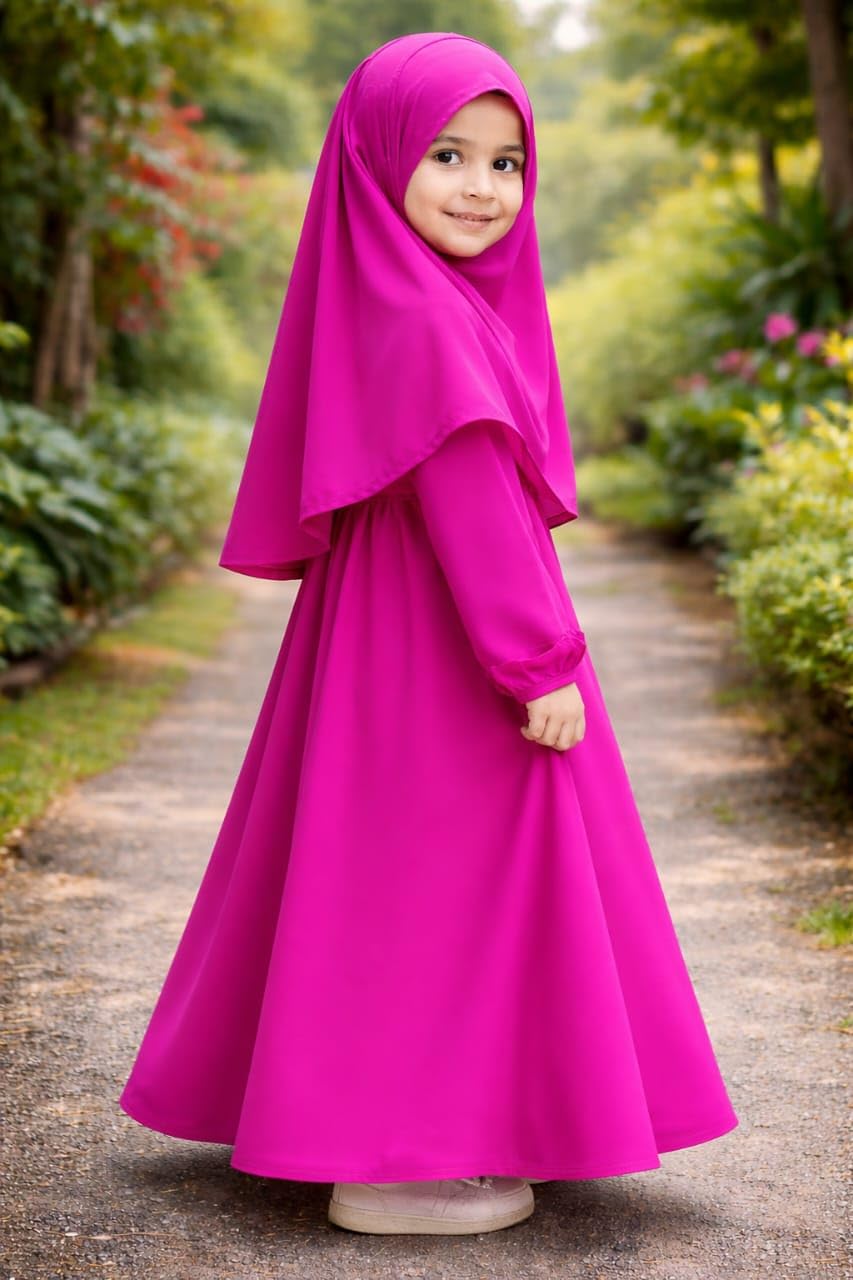 Suroj Shaikh || This beautiful Islamic prayer dress with hijab is designed for young worshippers, combining modesty with comfort. The vibrant fuchsia pink abaya features long sleeves and a graceful full-length design that flows elegantly. The matching two-piece hijab provides proper coverage while being easy to wear and adjust. Crafted from soft, flowing fabric, this traditional worship attire allows comfortable movement during prayers. The dress features a relaxed fit with gathered sleeves and a sweeping skirt that maintains its shape. Perfect for daily prayers, special occasions, or religious studies, this prayer set offers both functionality and style. The bright, cheerful colour makes it appealing for young wearers while maintaining appropriate religious standards. Available in various sizes, this prayer dress set makes an excellent choice for growing children who need comfortable yet proper worship attire.