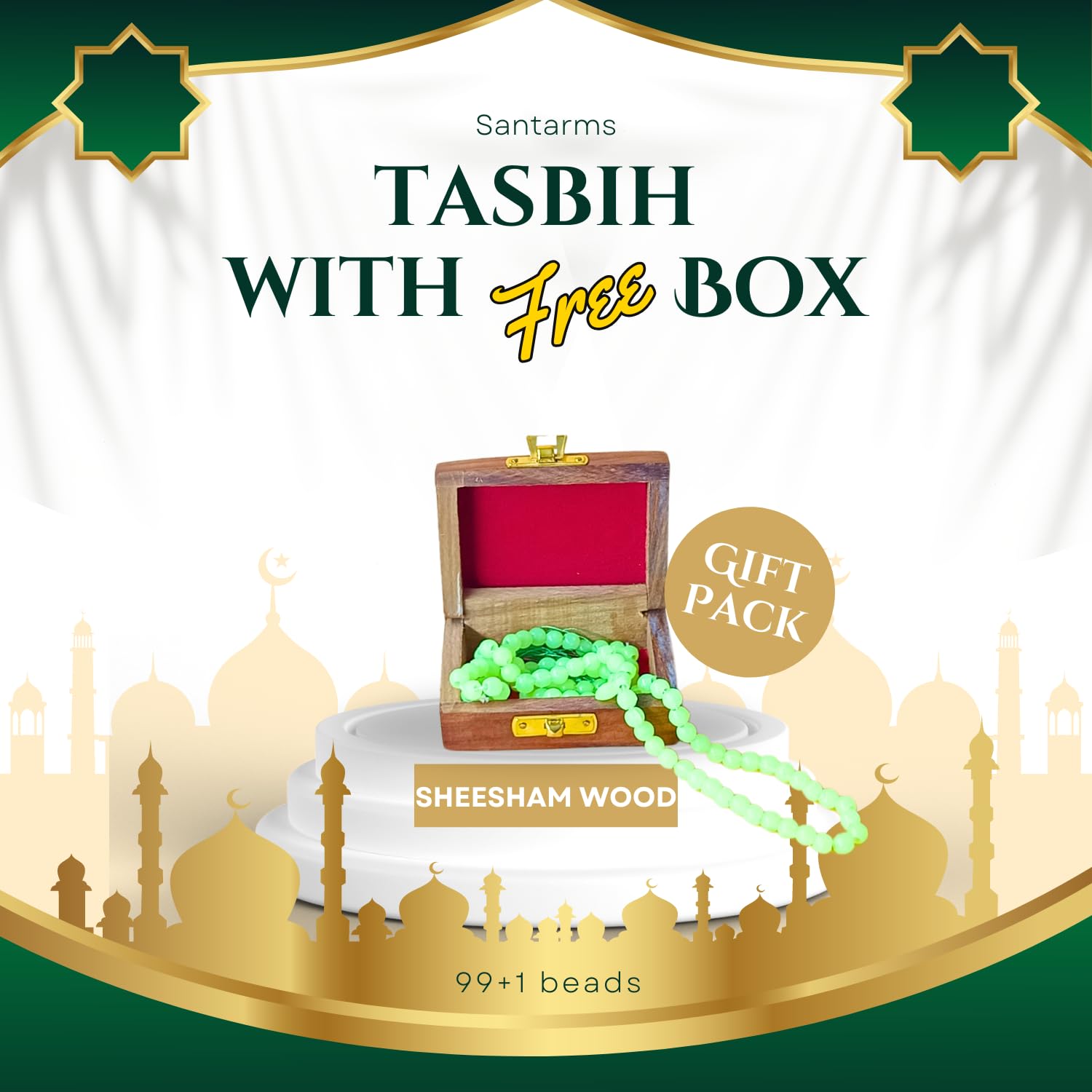 Embrace your faith and devotion with the Santarms Tasbeeh. This prayer counter features 99+1 beads, perfect for Islamic chants and prayers. The elegant wooden box provides safe storage and adds a decorative touch, making this Tasbeeh set a cherished item in any Muslim household.The 99+1 beads are designed to facilitate smooth counting and deep meditation. Housed in a beautifully crafted wooden box, this Tasbih set is a must-have for any devout Muslim looking to deepen their spiritual practice.Introducing the ultimate Tasbeeh set for Muslims – the Santarms Tasbeeh Combo Pack. This set includes 99+1 prayer beads and a premium wooden box, offering both functionality and elegance. Perfect for personal use or as a heartfelt gift, this Tasbeeh set is designed to enhance your spiritual journey and religious devotion.
