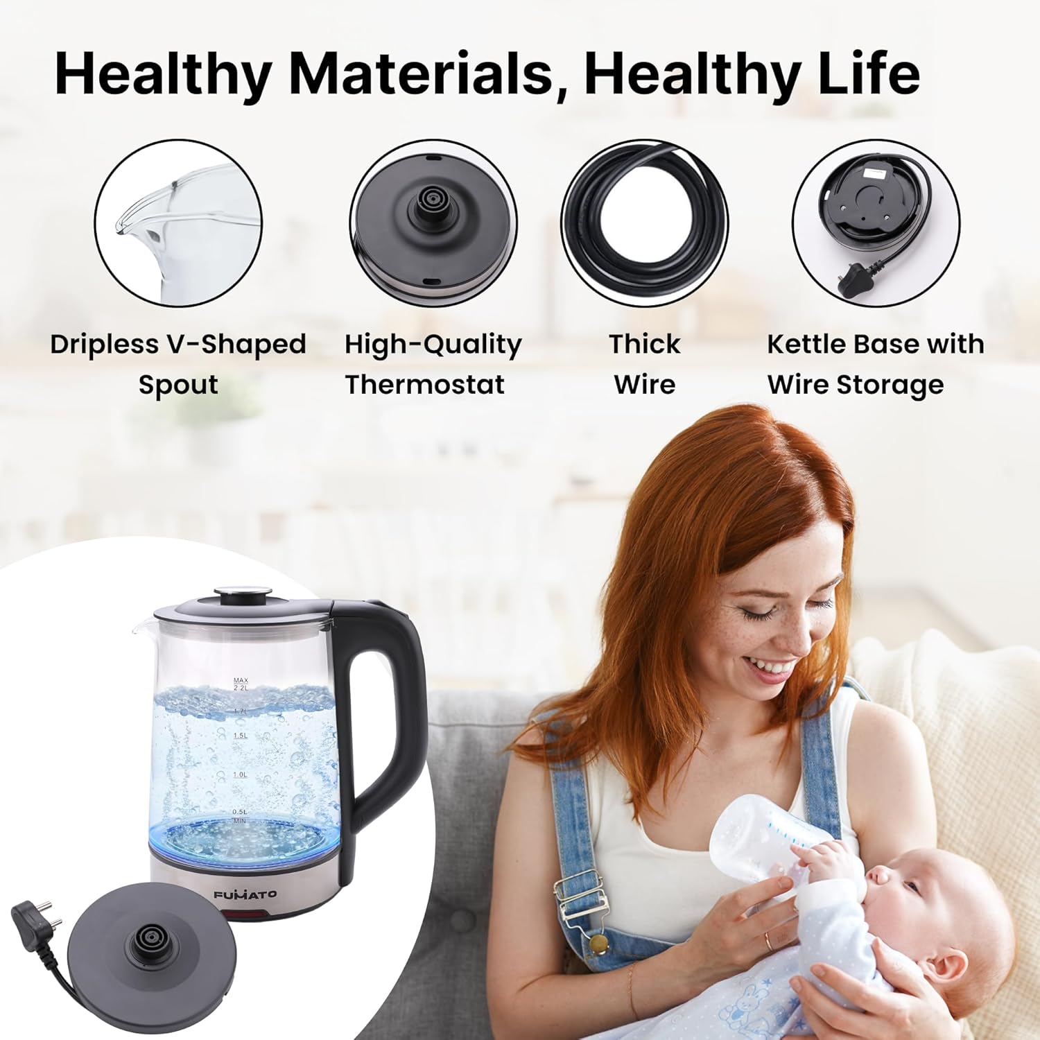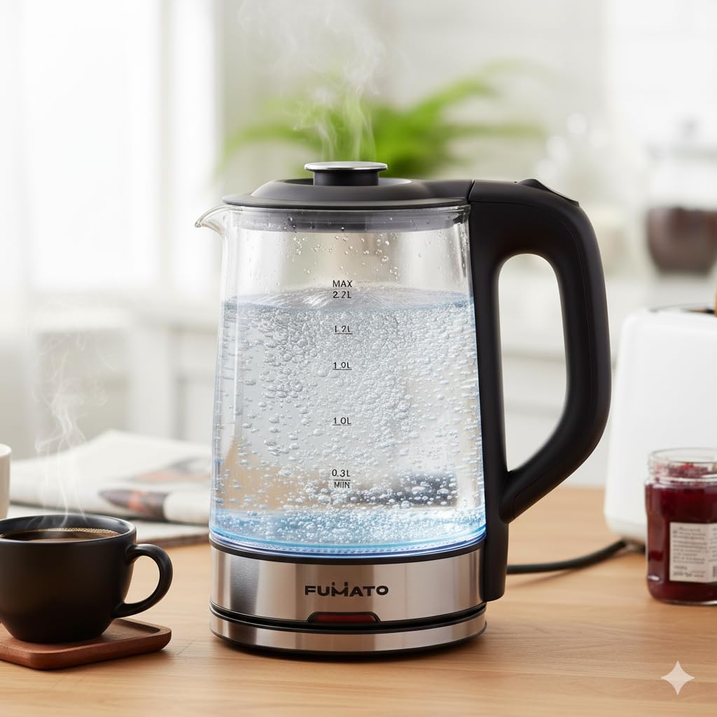 The Better Home FUMATO 2.2L Glass Kettle Electric- 1500W | Borosilicate Glass Body, Stainless Steel Bottom, Multipurpose, Easy to Clean With LED Indicator, Auto Shut Off With Dry Boil Protection
