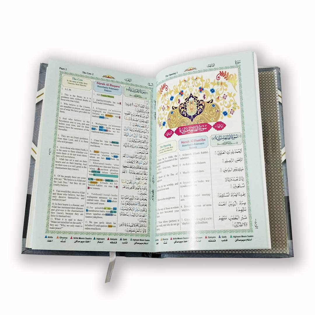 This colour coded system has been introduced to highlight the Rules of Tajweed with seven different Colours, each colour represents a Tajweed Rule. The Tajweed Rule allows the reciter to emphasise the accent, phonetics, rhythm and temper of The Quranic recitation. This humble effort is an attempt to facilitate the Tilaawah of The Holy Quran with proper Tajweed. This is a nice hardbound edition of the popular 3-column format Holy Quran with Colour Coded Arabic Text, Romanized (Transliterated) English, and Colour Coded English translation by Abdullah Yusuf Ali. Quran comes with the “Persian” script, commonly used in India, Pakistan and throughout the world. The advantage of a “romanized” transliteration of the Quran is that it allows those who are not aware of Arabic language & eager to recite and for the beginner to learn Quranic Arabic script to be able to sound out problematic verses or words of the Quran, and to be used as an aid in proper enunciation and pronunciation of Quranic Arabic text. It is a fact that no system of perfect transcription is possible.