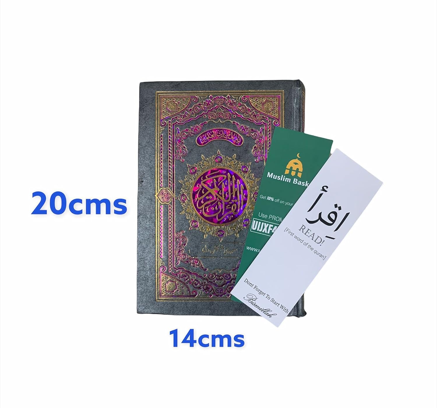 This is best selling 15 lines beautiful Tajweed Quran. Comes with 2 bookmarks only if you purchase from Muslim Basket seller. The size of the Quran is 17cmx24cm. Tajweed Qurans helps the readers to read Quran in right manner as it contains colour codes to help readers understand what is Gunnah, iqlaab, Qalqala, etc. Best is best product to gift to muslims, friends, family and kids.