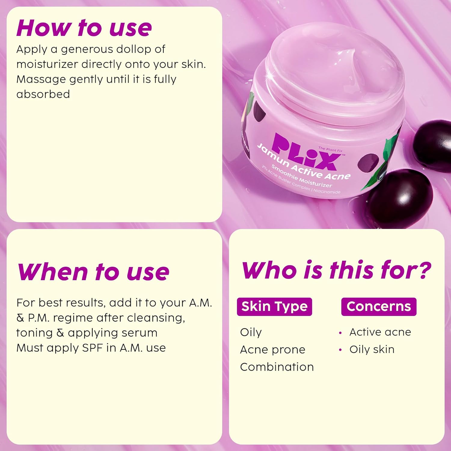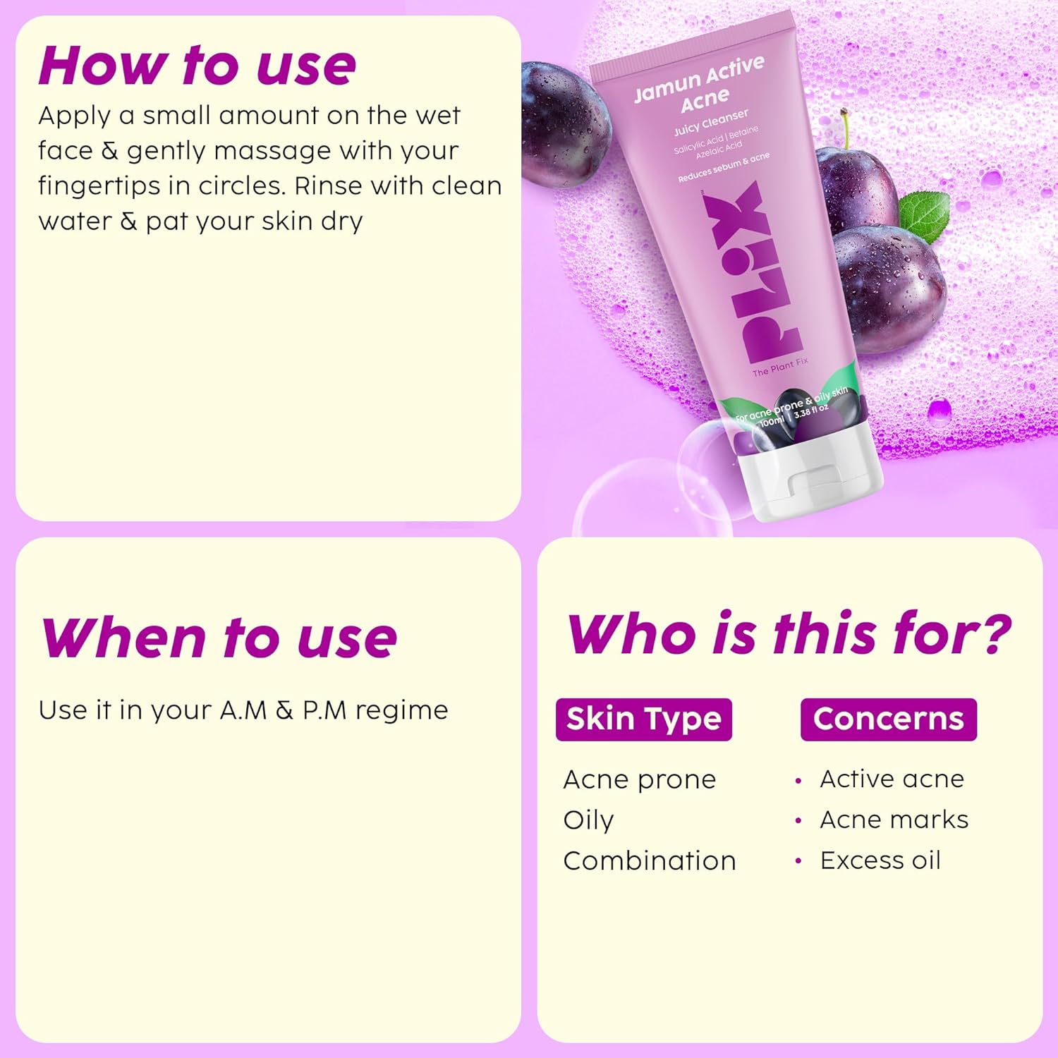 The Plant Fix Plix Jamun Active Acne Range With Cleanser, 2% Salicylic Acid Serum, Smoothie Moisturizer, & Toner l Reduces Active Acne l Detoxifies The Skin l Soothes Redness l All Skin Types