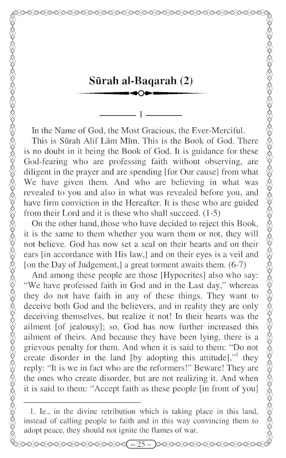 English rendering of the unique and fresh Urdu translation of the Qur’an by renowned Muslim scholar Javed Ahmad Ghamidi. The English rendering of his Urdu translation has been carried out by his distinguished student Dr Shehzad Saleem. — Translator’s Foreword As a student of the author for the past 30 years, I have had the privilege to discuss his translation on numerous occasions. These discussions helped me not only in ensuring accuracy in the translation but also in learning the thought process of the author in interpreting a Book that bears no parallel in the annals of mankind. The unique feature of the author’s translation is that it attempts to unfold the coherence of the discourse within the text through insertions in parenthesis. The purpose is to bring the readers closer to the diction of the Qur’ān and make them understand some of its nuances that may elude them because of the unique structure and style of classical Arabic in which it is couched.