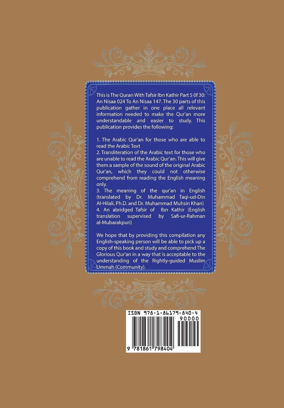 This is The Quran With Tafsir Ibn Kathir 5 0f 30. This Part of the Qur’an covers Chapter 4: An Nisaa 024 To An Nisaa147. The 30 Parts of this publication gather in one place all relevant information needed to make the Qur’an more understandable and easier to study. This publication provides the following:
