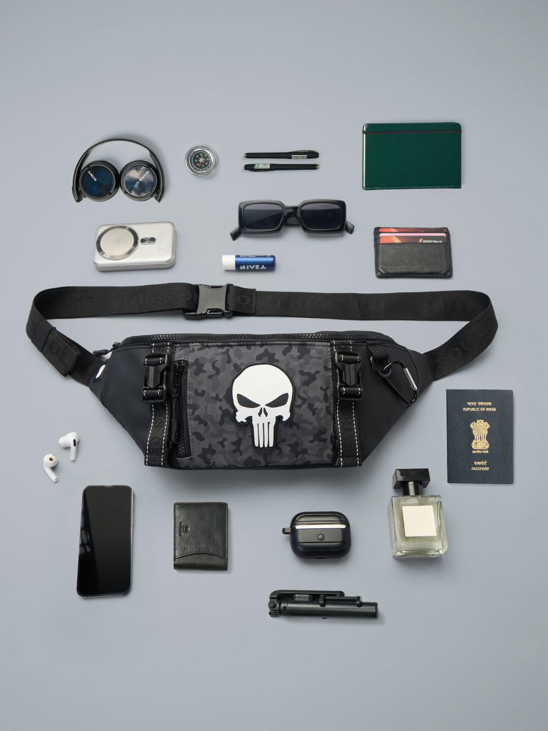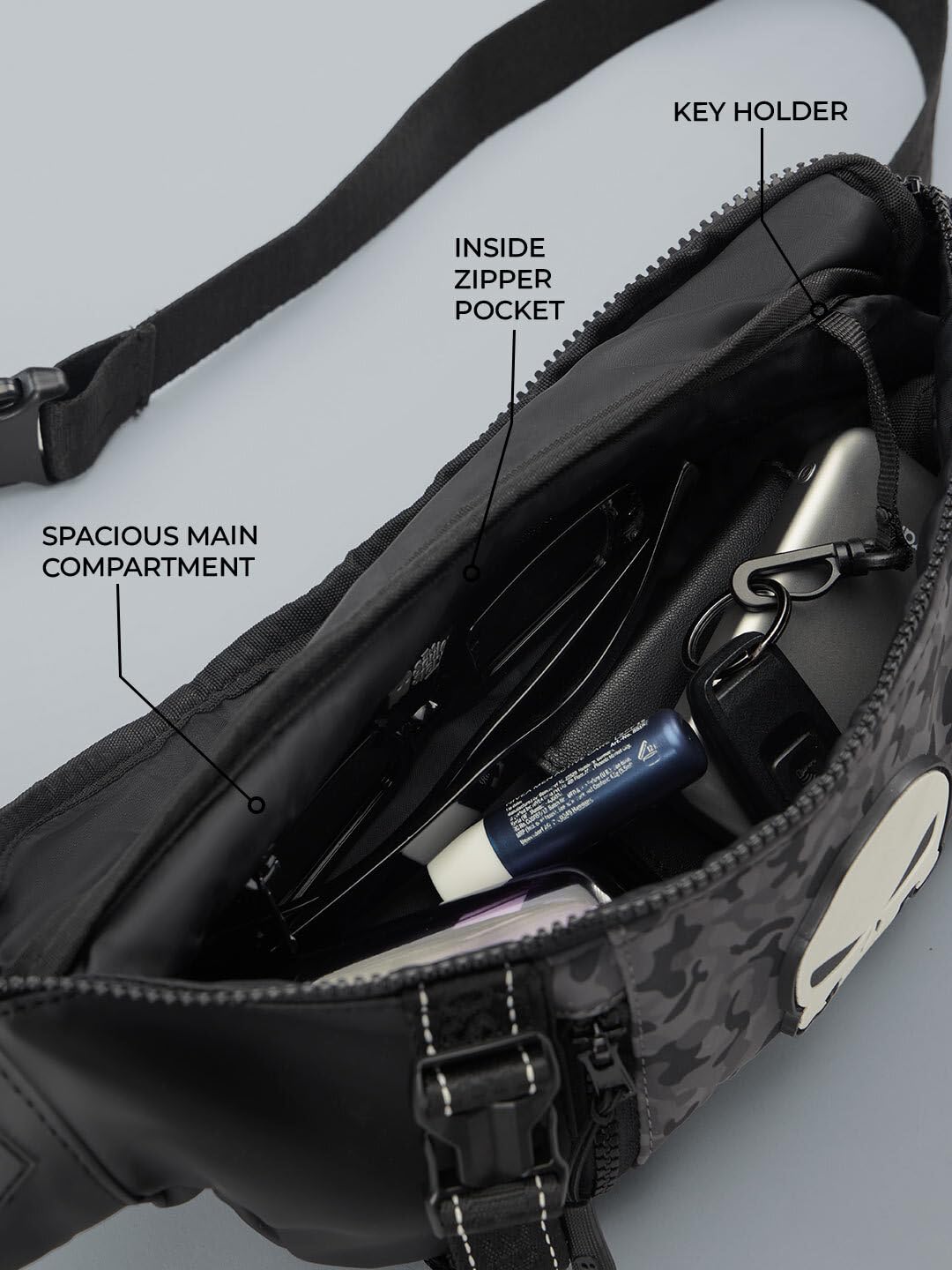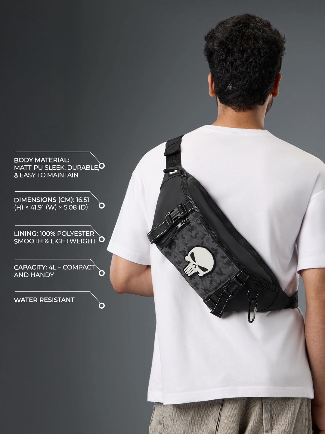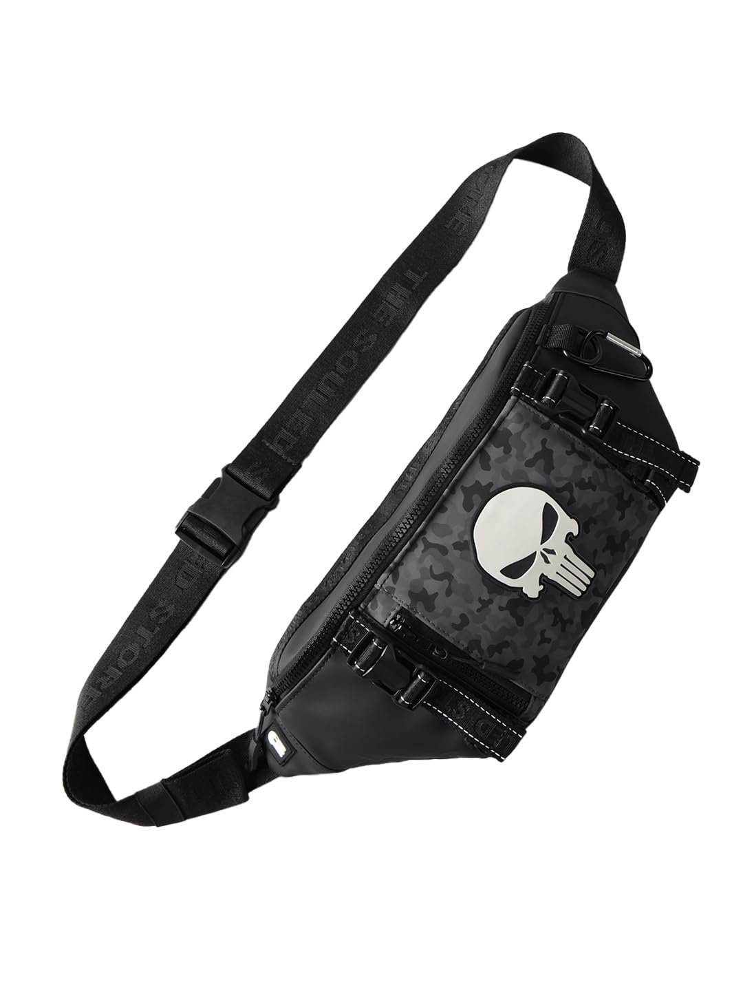 The Souled Store Marvel Punisher Utility Gear Fanny Pack Crossbody Sling Bag 4L Spacious Durable PU with Adjustable Strap Travel Daily Use Waist Bag for Men and Women