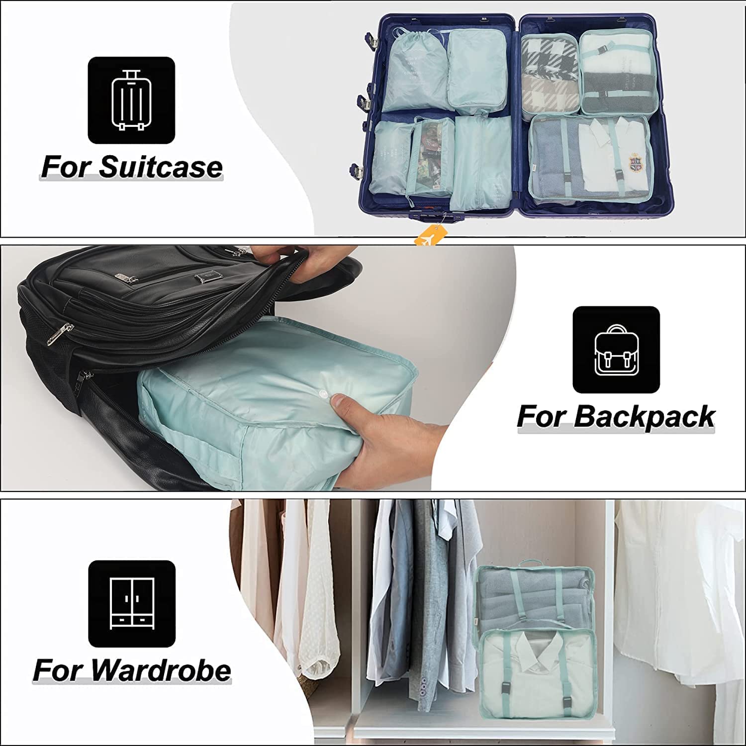 Packing Cube Set Details : 7 pcs packing organizers set ( 3 different size clothes storage bags or cubes + 3 laundry pouches which can also be used as 1 bra/underwear bag , 1 cosmetics bag , 1 toiletry bag + 1 bonus drawstring shoe bag). The 3-laundry pouch can be used for your used clothes while the compression garment bag can be used for footwears.