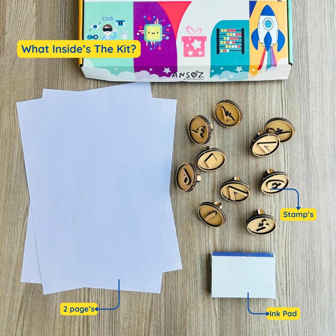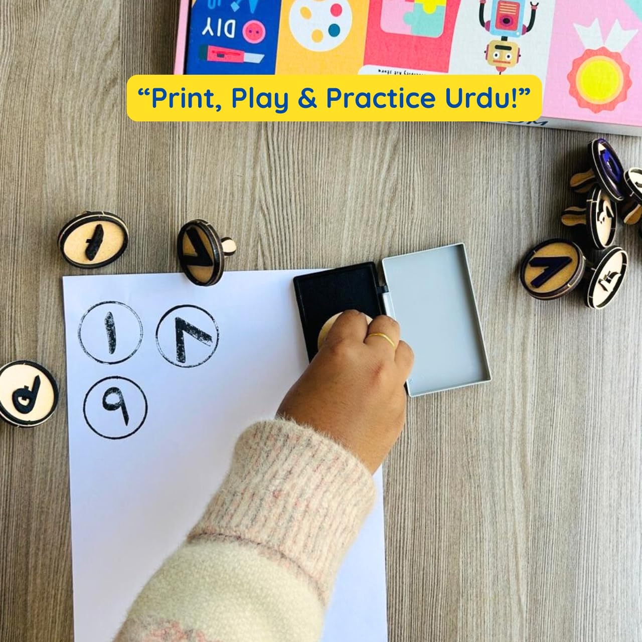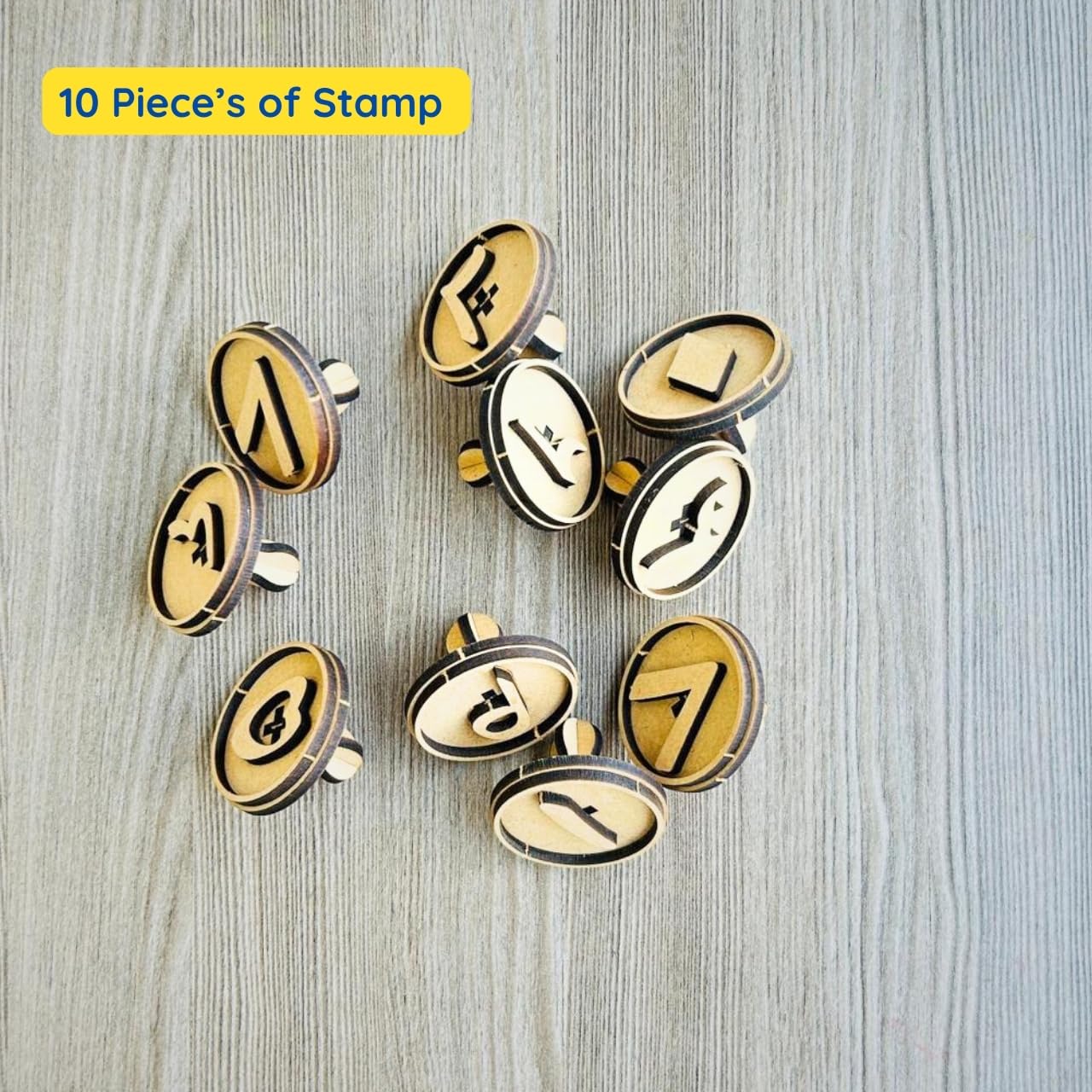 Make number learning fun with this Urdu Numbers Wooden Stamp Kit for kids. This kids stamping kit includes 10 durable wooden Urdu number stamps, a quality stamp pad, and practice sheets for instant use. Perfect for number recognition, counting practice, and Islamic studies, this easy-grip stamp kit supports fine motor skills and early numeracy development. Crafted from sturdy wood with smooth edges, these stamps for kids are safe, reusable, and perfect for home or classroom learning.