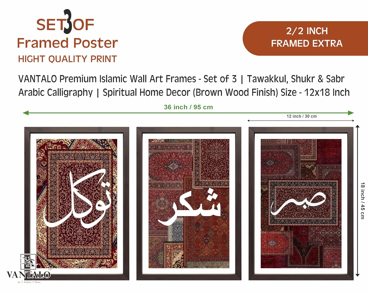 Be the first to review “VANTALO Premium Set of 3 Islamic Wall Art Frames, Arabic Calligraphy Tawakkul Shukr Sabr, Persian Carpet Inspired Background”