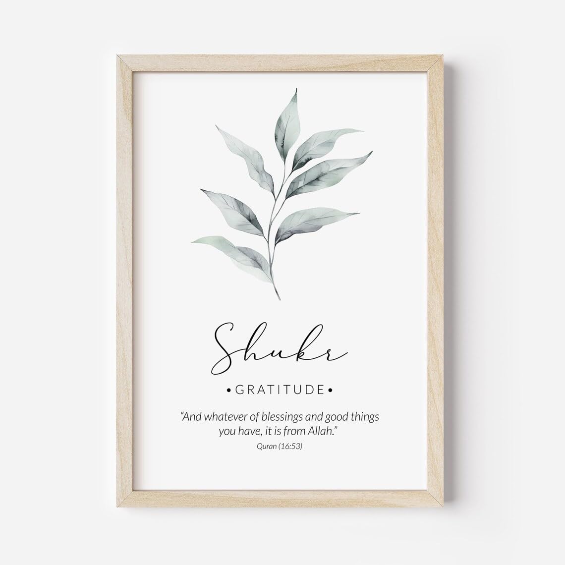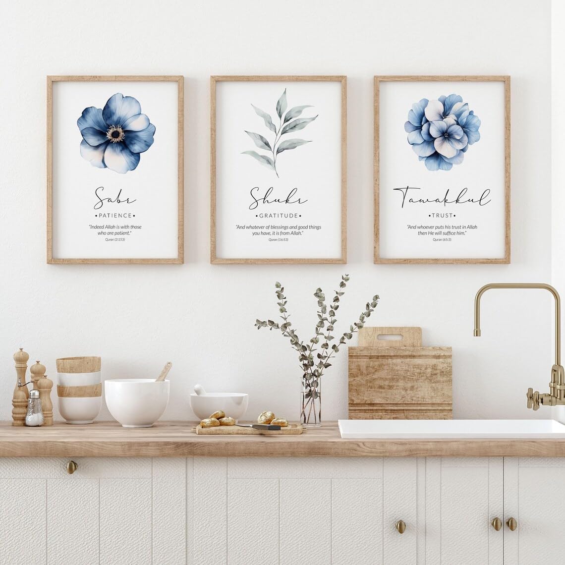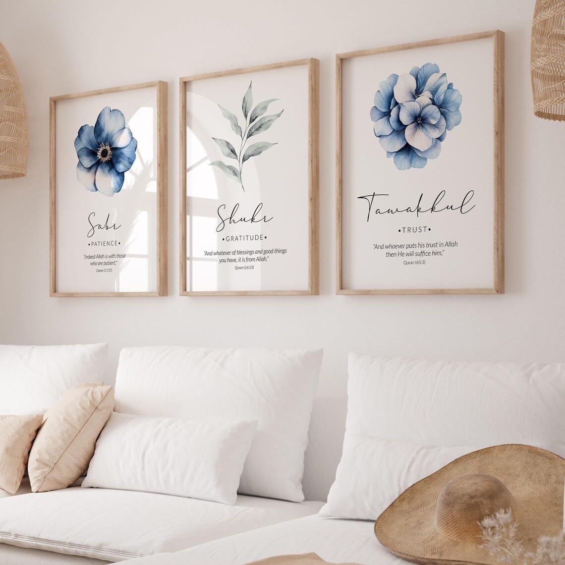 Transform your living space with this elegant set of three Islamic wall art prints featuring the beautiful concepts of Sabr (Patience), Shukr (Gratitude), and Tawakkul (Trust). Each piece showcases stunning watercolour florals in serene blue tones, perfectly complemented by minimalist typography and meaningful Quranic verses. The artwork comes in wooden frames that add a natural, sophisticated touch to the contemporary design. The delicate balance of blue flowers, sage-green leaves, and clean white backgrounds creates a harmonious aesthetic that suits modern home décor. These inspirational pieces work beautifully as a set in bedrooms, prayer rooms, living areas, or offices, serving as daily reminders of these essential spiritual virtues. The professional framing ensures durability and easy installation, while the high-quality prints maintain their vibrancy. Perfect for those seeking to add both aesthetic beauty and spiritual meaning to their walls, this collection offers a tasteful blend of modern artistry and timeless wisdom.