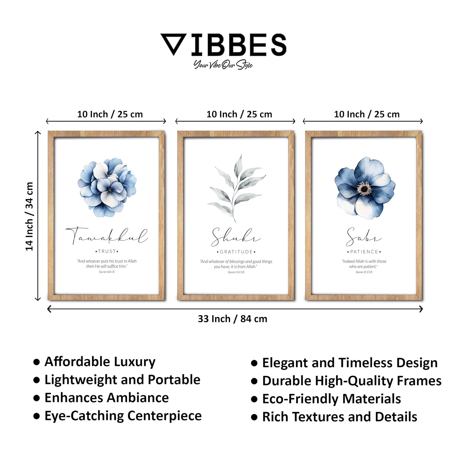 Be the first to review “VIBBES Islamic Wall Art Set of 3, Sabr Shukr Tawakkul, Modern Islamic Minimal Home Decor, Wooden Frame Prints with Blue Flowers (Medium – 14×10 Inch)”
