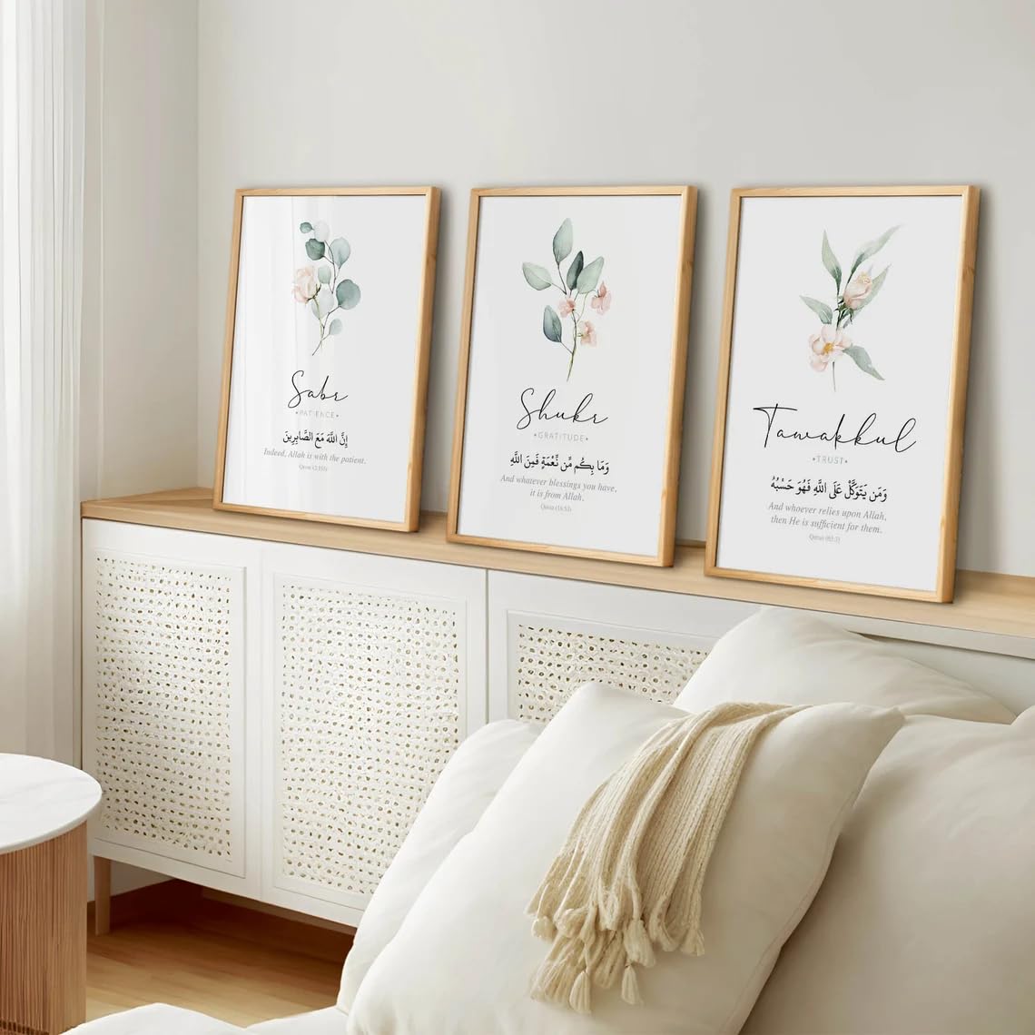 ELEGANT DESIGN: Set of 3 Islamic wall art prints featuring Sabr, Shukr, and Tawakkul calligraphy with delicate watercolour floral elements in sage green and blush pink tones