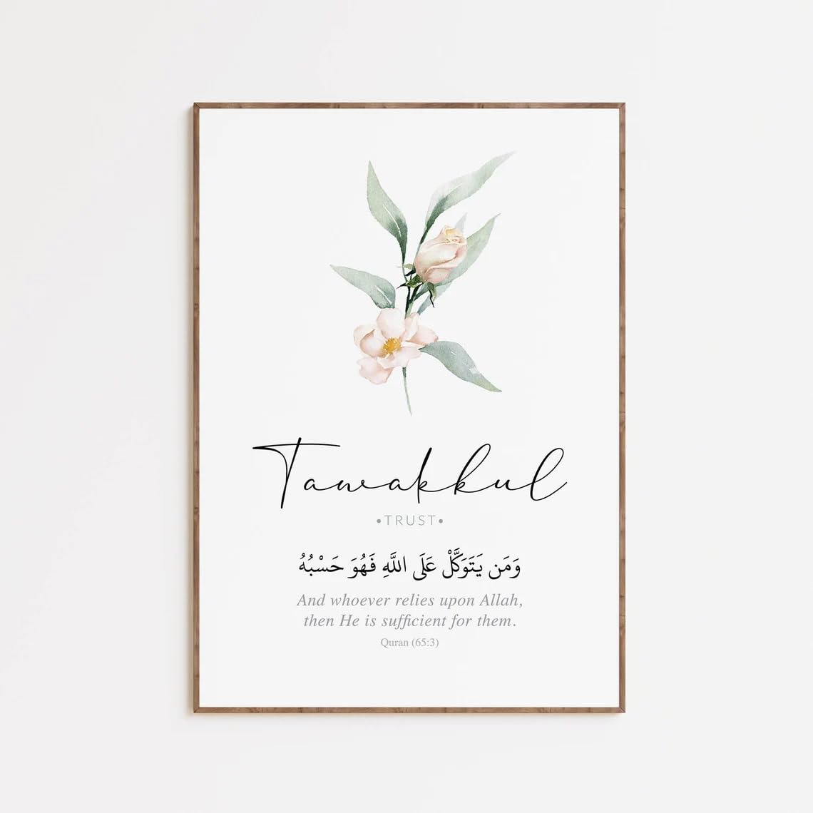 Transform your living space with this elegant set of three Islamic wall art prints featuring the beautiful concepts of Sabr (patience), Shukr (gratitude), and Tawakkul (trust in Allah). Each piece combines delicate watercolour florals in soft sage and blush tones with Arabic calligraphy and English translations of meaningful Quranic verses. The minimalist design, set in light wooden frames, creates a serene and contemporary aesthetic that perfectly complements modern home décor. The artwork is presented on a pristine white background, making it versatile enough to enhance any room’s ambiance. This sophisticated trio works particularly well in living rooms, prayer spaces, or bedrooms, adding both spiritual significance and artistic beauty to your walls. The gentle sage green and subtle pink florals create a harmonious balance, while the elegant typography adds a touch of sophistication. These prints serve as both meaningful reminders of essential Islamic virtues and stunning decorative pieces that bring tranquility to your space.