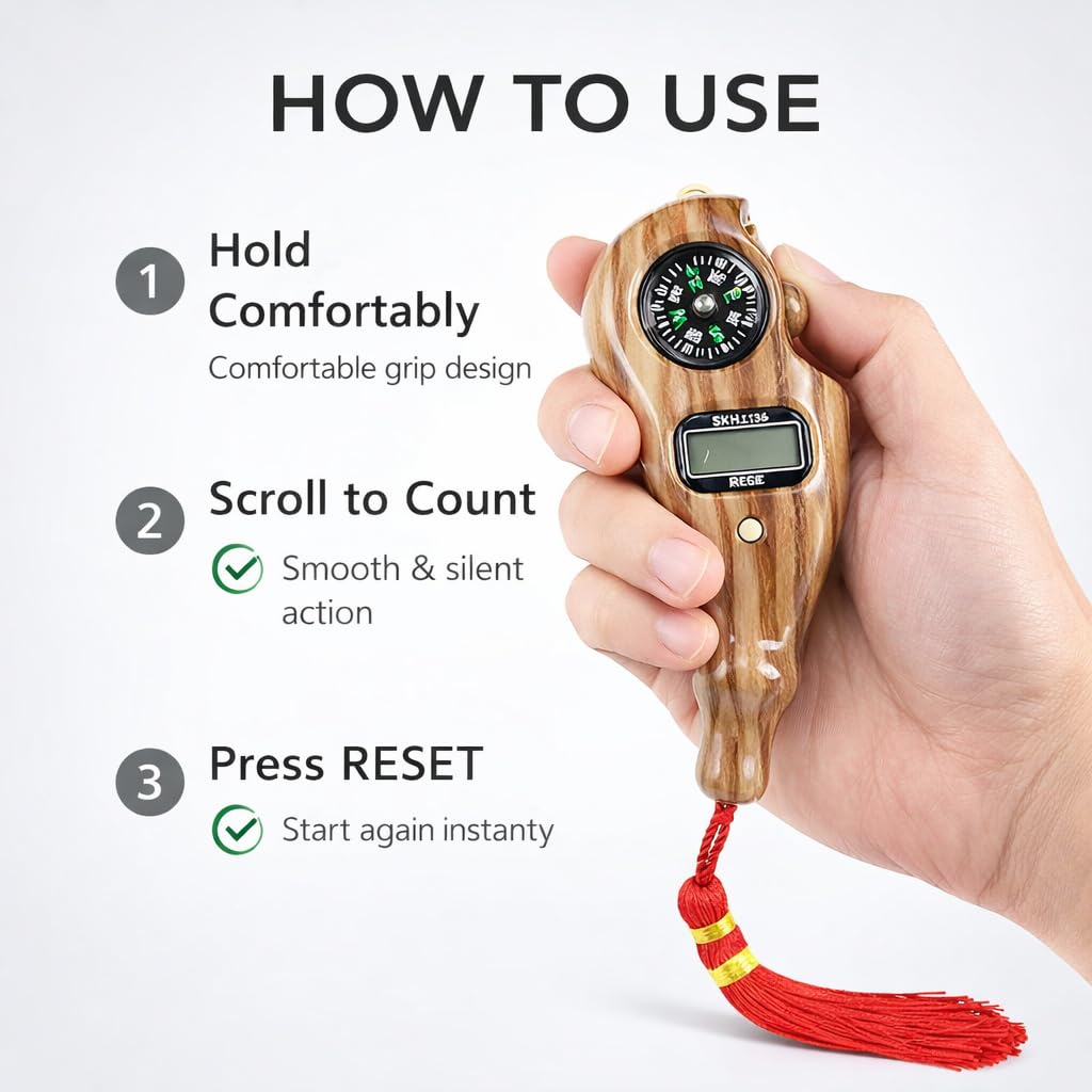 DIGITAL COUNTER: Features a clear LCD display with 5-digit counting capacity and easy reset button for accurate prayer or mantra counting