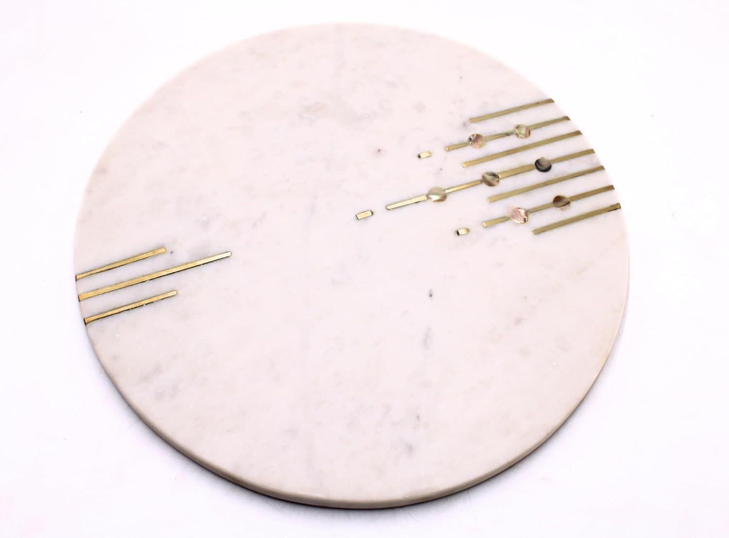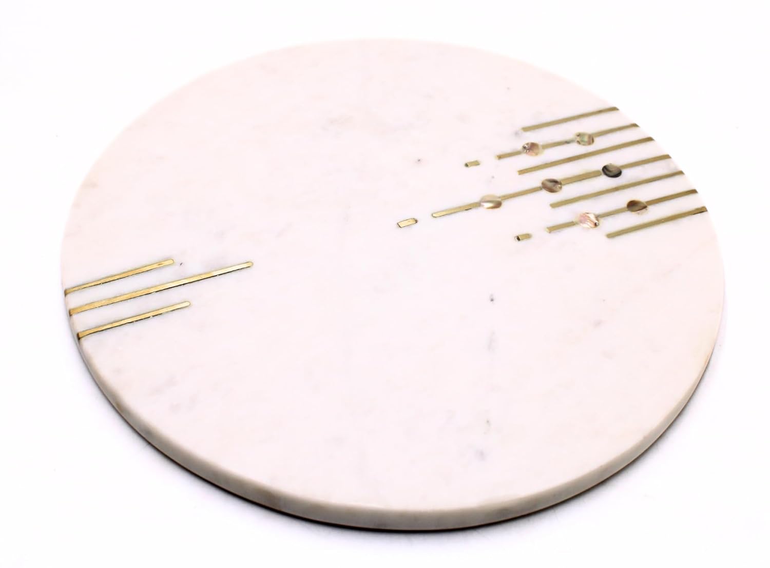 Add a touch of luxury to your kitchen with this exquisite White Marble Handmade Chopping Board with Brass Inlay Work. Crafted from premium-quality natural marble, this chopping board is not just a kitchen essential but also a statement piece. The intricate brass inlay design enhances its elegance, making it perfect for both food preparation and stylish serving. Its non-porous surface resists stains and odors, ensuring hygiene and easy maintenance. Whether you’re chopping vegetables, slicing bread, rolling dough, or serving cheese and appetizers, this handcrafted board is a perfect blend of beauty and functionality.