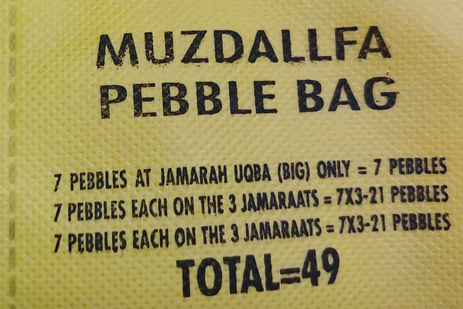 Premium Craftsmanship: Meticulously crafted with attention to detail, offering both functionality and aesthetic appeal. Compact and Lightweight: Designed to be compact and lightweight, making it easy to pack and carry without adding extra bulk to your luggage.Thoughtful Gift: Perfect for gifting to friends and family members embarking on their spiritual journeys or those who love to travel.Peace of Mind: Travel with confidence knowing your essentials are securely stored in this reliable and durable pebble bag.Lightweight Hajj kankari Bag (Pebble Bag).THIS IS SMALL KANKARI BAG IN WHICH YOU CAN CARRY KANKARI EASILY FOR THREE DAYS WHICH IS ALSO MENTIONED ON THESE BAGS HOW MANY KANKARI YOU WILL THROW ON SHAITAN.DO NOT ADHERE WITH COLORS. It will either same or Different depend on the availability