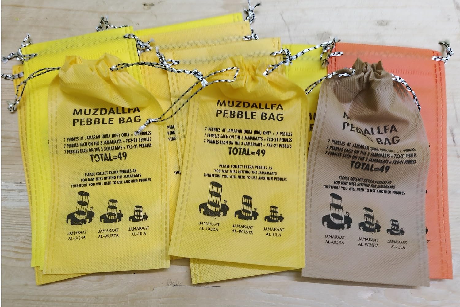 Premium Craftsmanship: Meticulously crafted with attention to detail, offering both functionality and aesthetic appeal. Compact and Lightweight: Designed to be compact and lightweight, making it easy to pack and carry without adding extra bulk to your luggage.Thoughtful Gift: Perfect for gifting to friends and family members embarking on their spiritual journeys or those who love to travel.Peace of Mind: Travel with confidence knowing your essentials are securely stored in this reliable and durable pebble bag.Lightweight Hajj kankari Bag (Pebble Bag).THIS IS SMALL KANKARI BAG IN WHICH YOU CAN CARRY KANKARI EASILY FOR THREE DAYS WHICH IS ALSO MENTIONED ON THESE BAGS HOW MANY KANKARI YOU WILL THROW ON SHAITAN.DO NOT ADHERE WITH COLORS. It will either same or Different depend on the availability