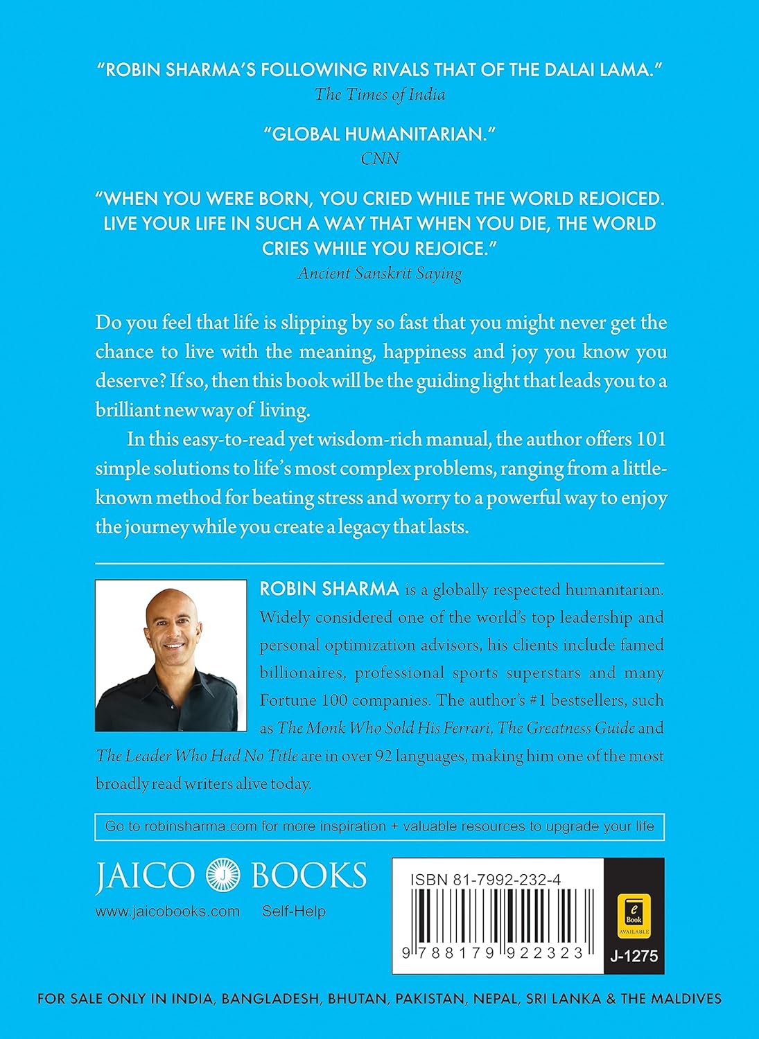Life Lessons From The Monk Who Sold His Ferrari Do You Feel that life is slipping by so fast that you might never get the chance to live with the meaning, happiness and joy you know you deserve? If so, then this book will be the guiding light that leads you to a brilliant new way of living. In this easy-to-read yet wisdom-rich manual, the author offers 101 simple solutions to life’s most complex problems, ranging from a little-known method for beating stress and worry to a powerful way to enjoy the journey while you create a legacy that lasts. “When You Were Born, You Cried While The World Rejoiced. Live Your Life In Such A Way That When You Die, The World Cries While You Rejoice.” Ancient Sanskrit Saying