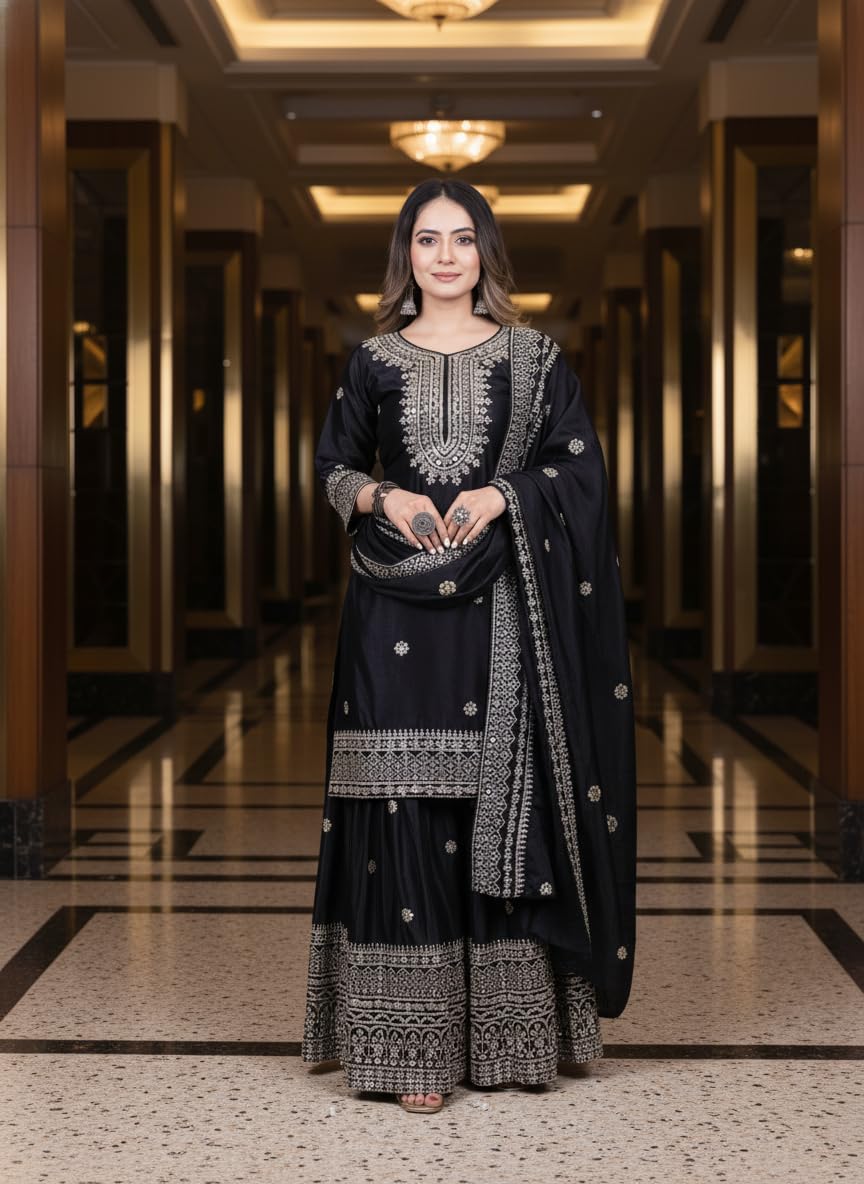 Women Chinon Printed Embroidery Work Round Neck 3/4 Sleeve Straight Regularfit Kurti and Sharara with Dupatta Set