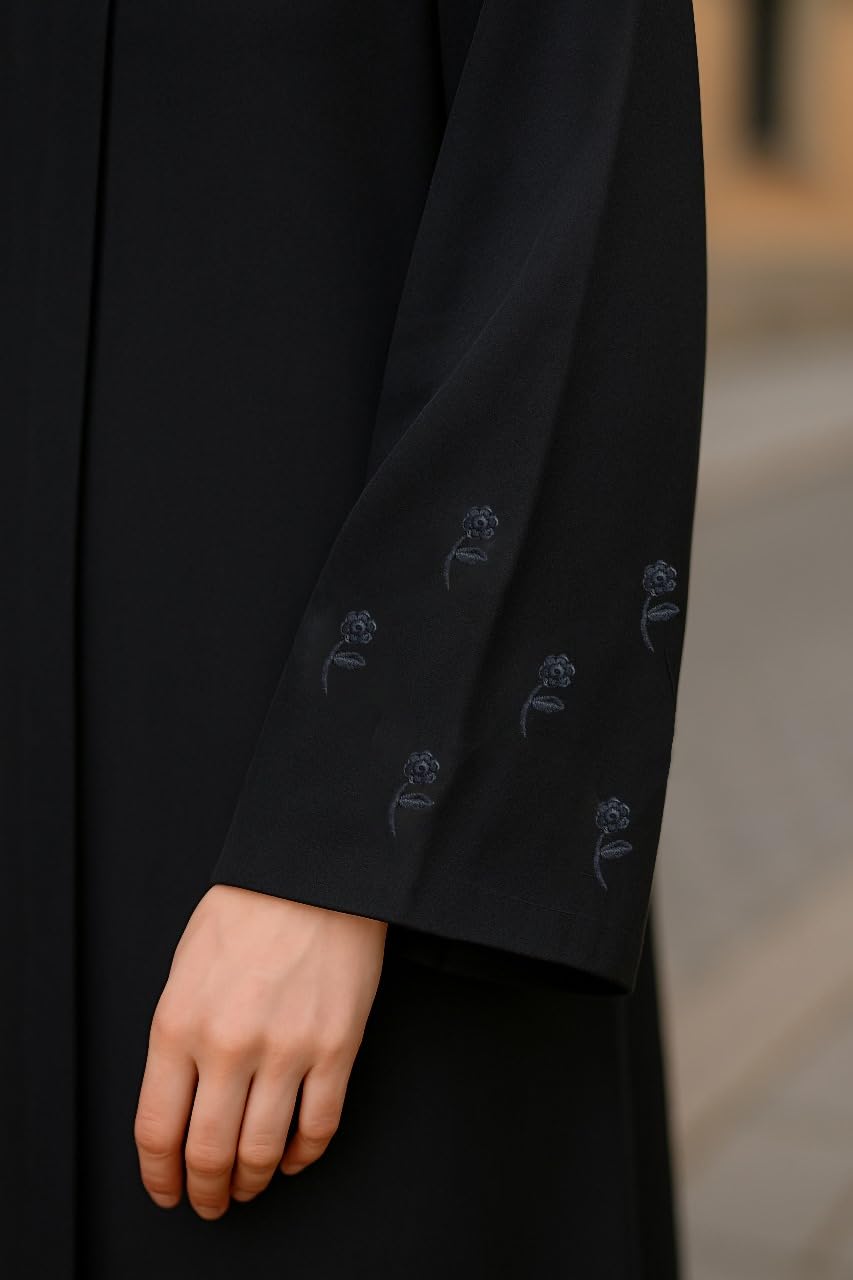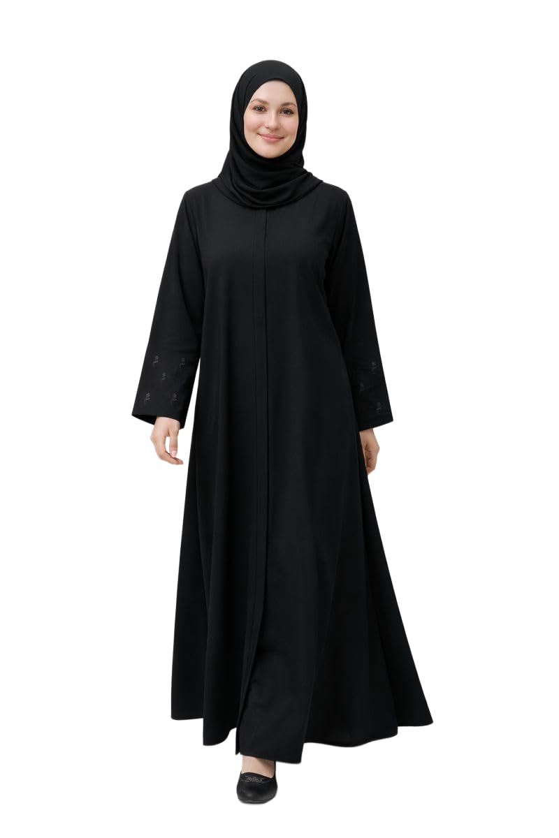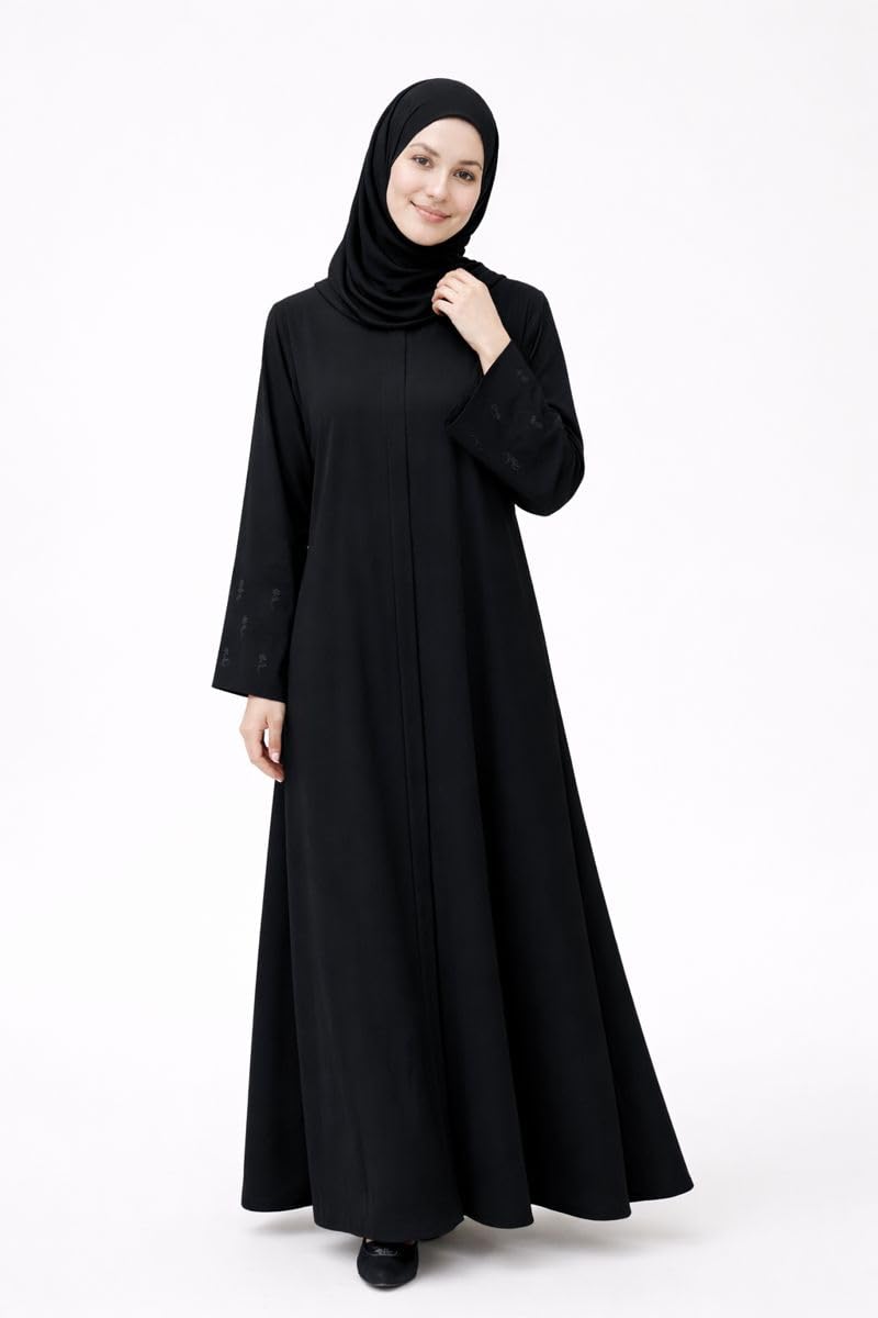 Women’s Black Abaya with Hijab, Embroidered Sleeves, Modest Islamic Dress, Long Sleeve