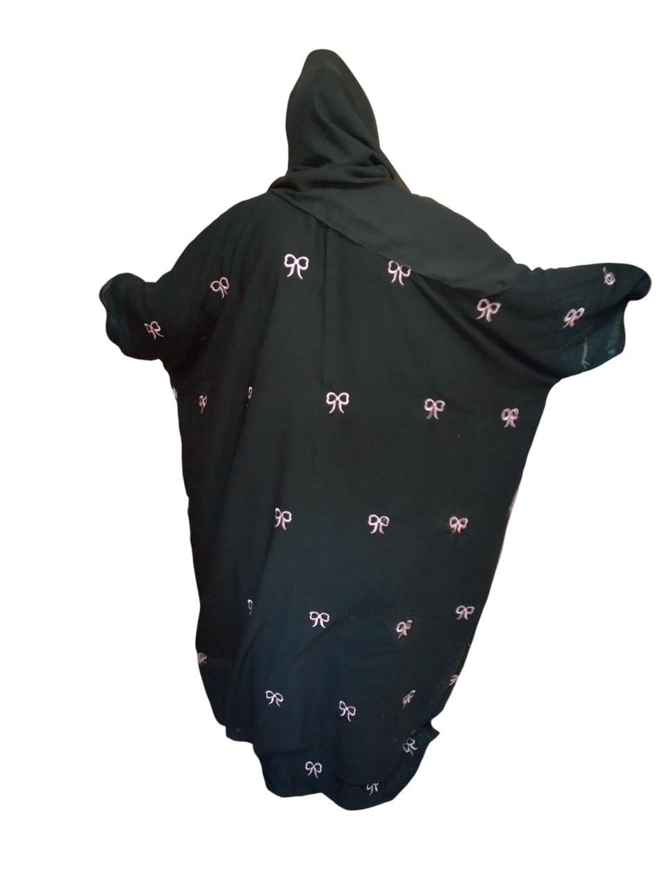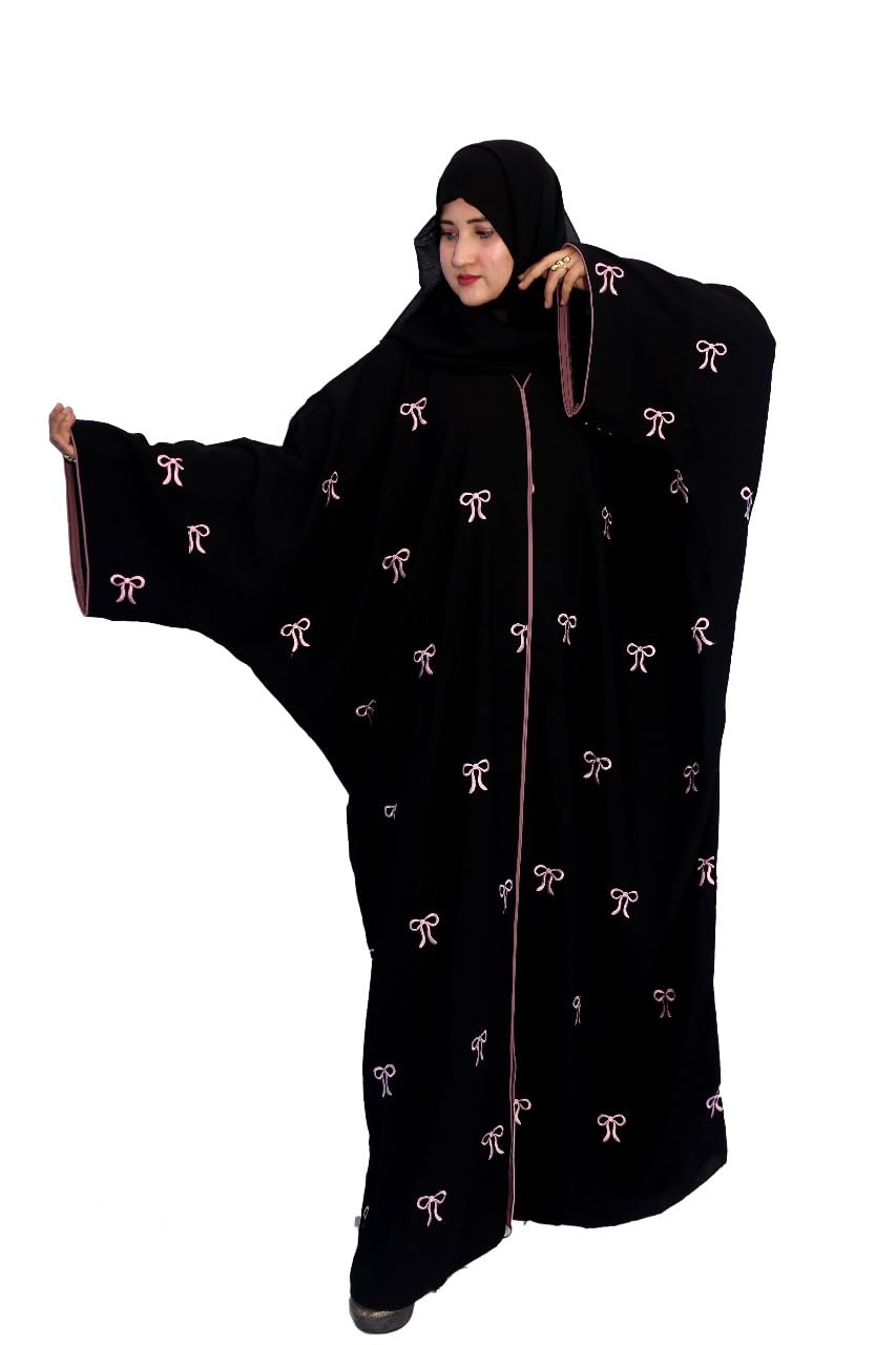 Women’s Black Abaya with Pink Bow Pattern, Full Length Traditional Islamic Burqa, Up to 78 Inches round Chest and 56 inches long NO DUPATTA ABAYA.