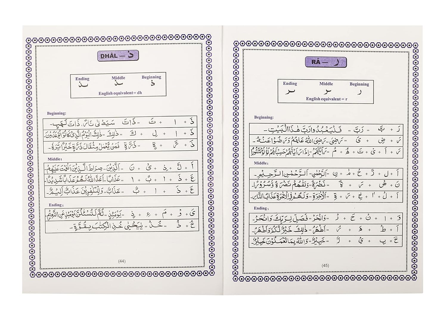 This large-sized book comprises the rhythmic method to learn Quran. It contains the basics of the Holy Qur’an for beginners and kids. These include the Arabic alphabet, vowels, pronunciations, etc. Arabic pronunciation is taught through English equivalents.