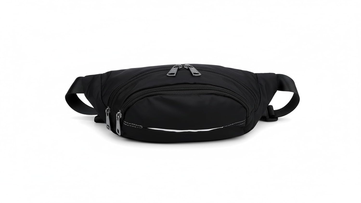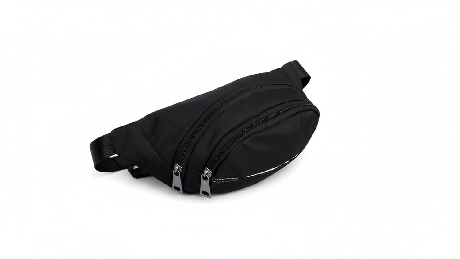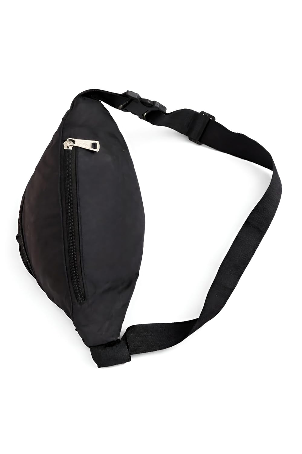 “Side view of black waist bag with dual zip compartments and adjustable strap”“Side view of black waist bag with dual zip compartments and adjustable strap”