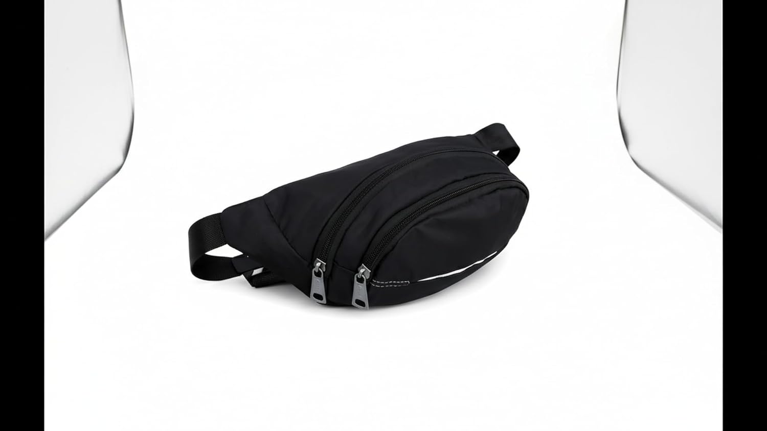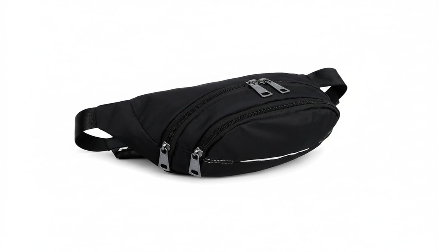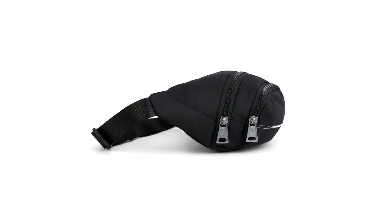 “Side view of black waist bag with dual zip compartments and adjustable strap”“Side view of black waist bag with dual zip compartments and adjustable strap”