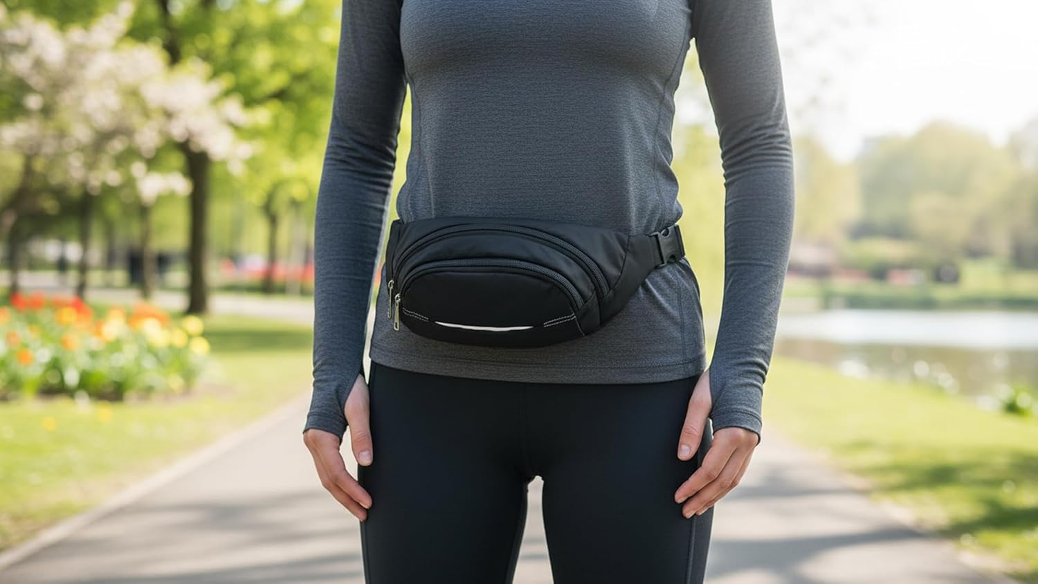 “Woman wearing black waist bag crossbody style in outdoor urban setting”“Woman wearing black waist bag crossbody style in outdoor urban setting”