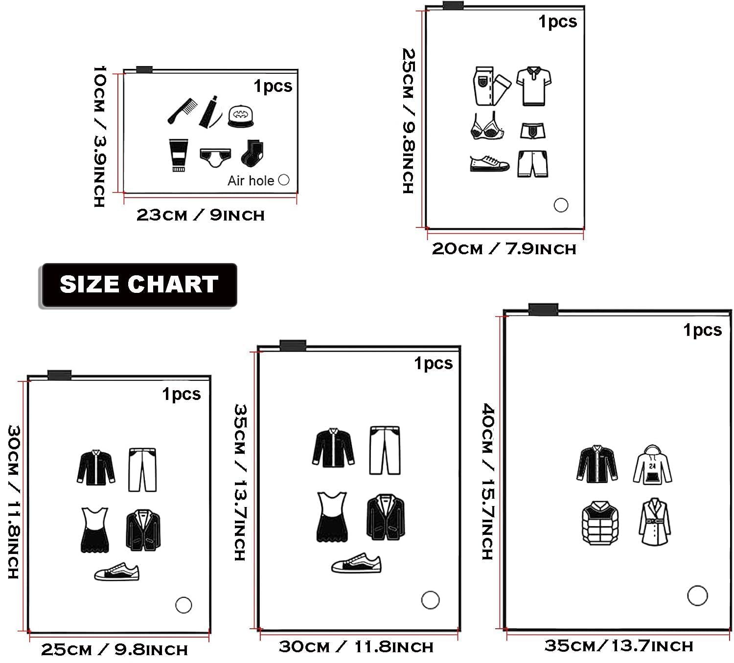 PACKAGE INCLUDED: – 1 x (35cm x 40cm) bag, 1 x (30cm x 35cm) bag, 1 x (25cm x 30cm) bag, 1 x (20cm x 25cm) bag, 1 x (23cm x 10cm) bag